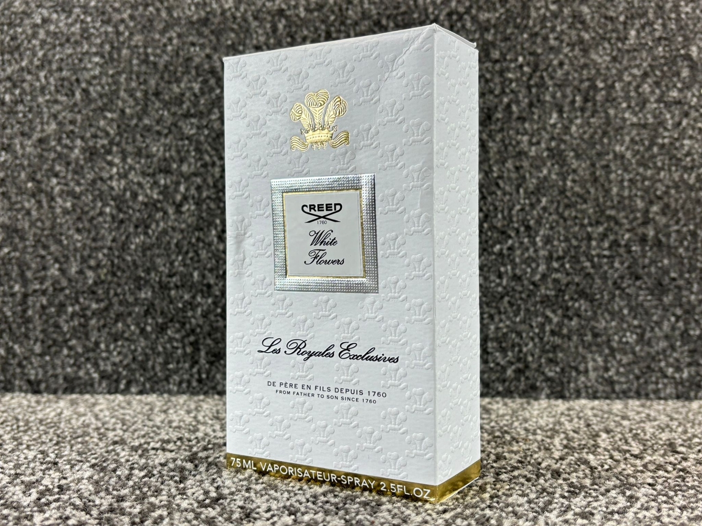 A 75ml bottle of Creed White Flowers Vaporisateur Spray, presented in its original presentation box, offering a refined and elegant floral composition from the House of Creed. Created as a tribute to classic femininity and graceful craftsmanship, White Flowers is a timeless fragrance that reflects the brand’s heritage of traditional perfumery with a soft, romantic character.