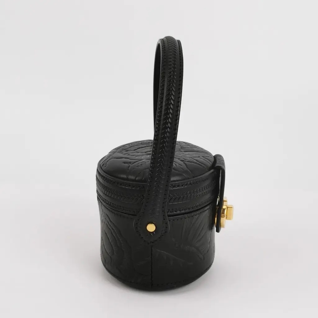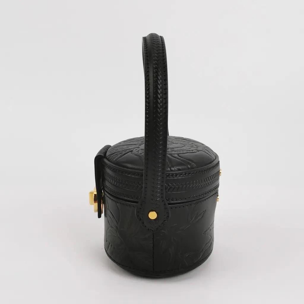 A Dior black embossed leather mini vanity case, crafted in a structured, rounded silhouette that delivers both elegance and statement appeal. The intricate embossed pattern subtly enhances the leather, creating depth and texture, while the gold-tone CD clasp at the front provides a striking focal point and unmistakable signature finish. A curved top handle completes the design, adding a refined and distinctive touch.
