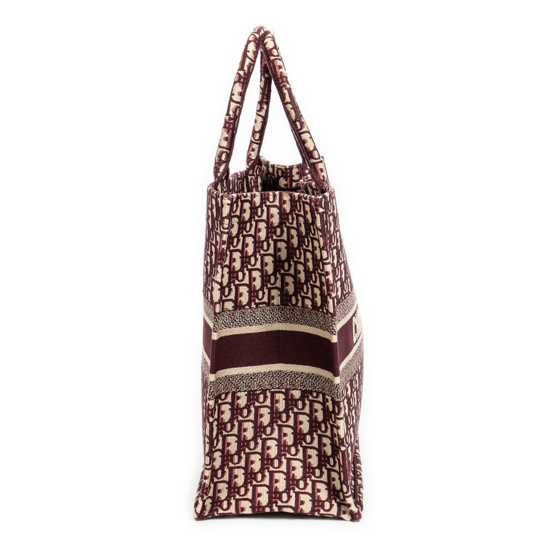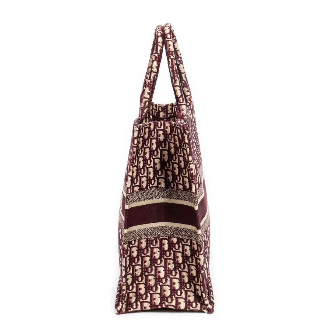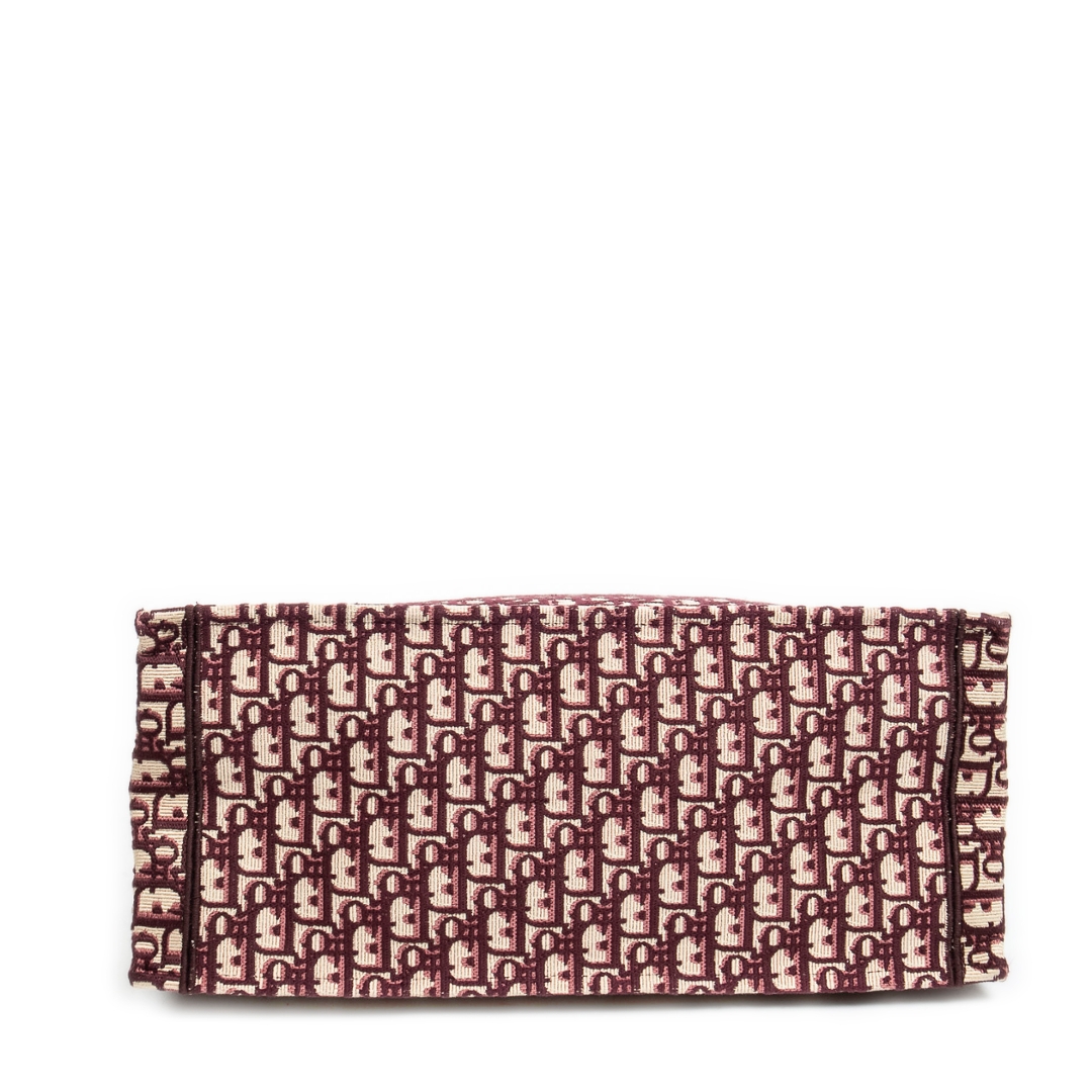 A vintage burgundy and baige canvas Dior Book Tote bag with a certificate of authenticity, Approximately 36cm height, 41cm width.