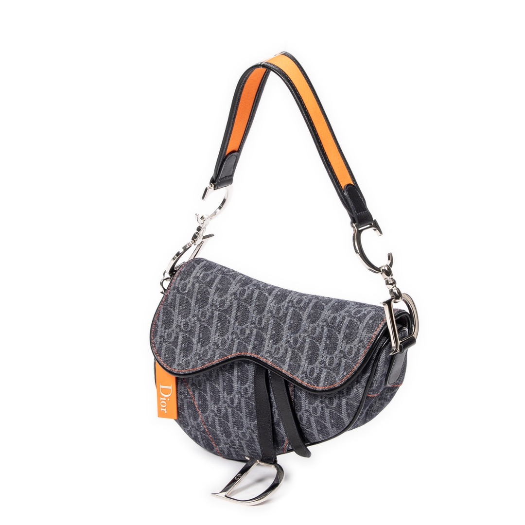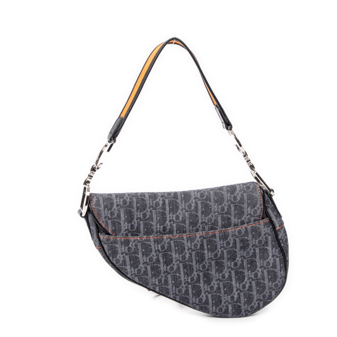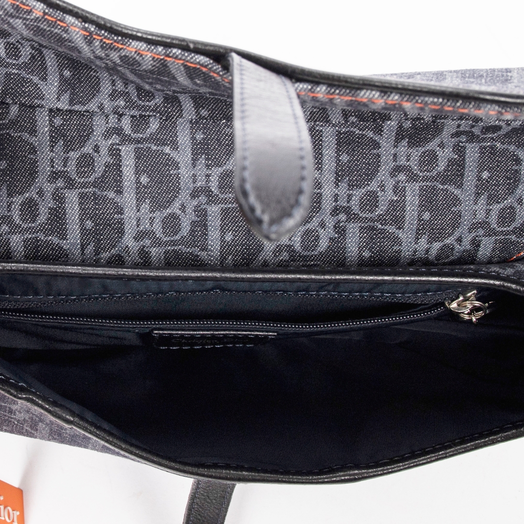 A vintage denim blue canvas Dior Flight Saddle bag — a bold reinterpretation of one of Dior’s most iconic silhouettes, blending heritage craftsmanship with a modern, street-inspired edge. Crafted from durable denim blue canvas, the bag features the instantly recognisable Dior monogram pattern, contrasted beautifully with orange leather accents for a striking, contemporary finish.