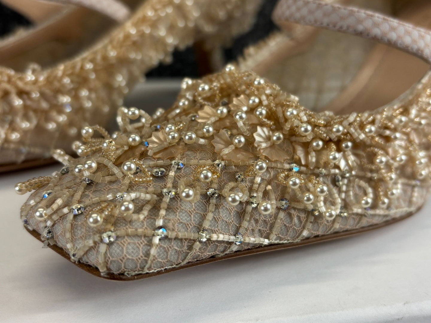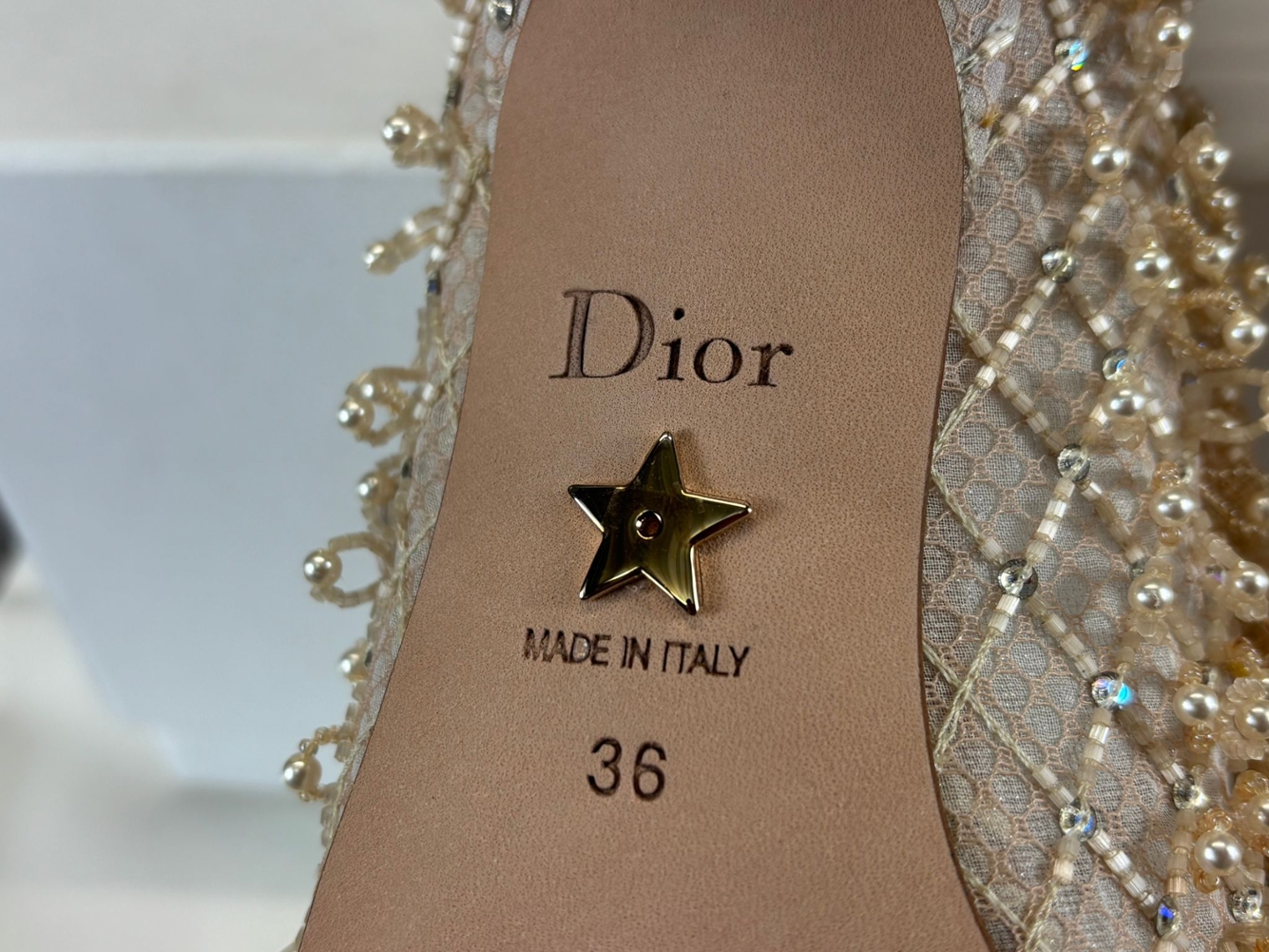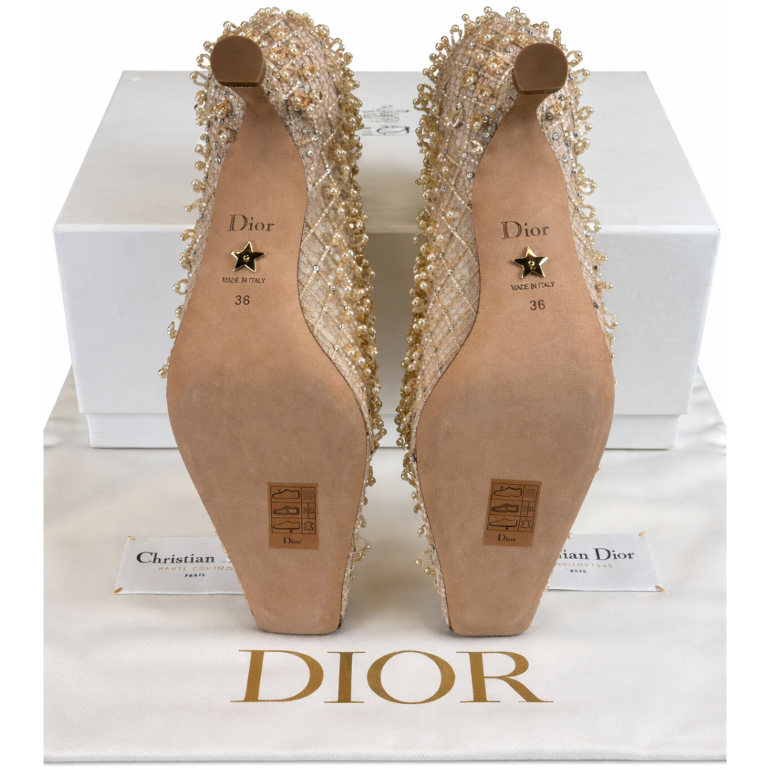 - > Dior Haute Couture Nude Embellished Mesh Pumps with Pearl & Beaded Detailing.