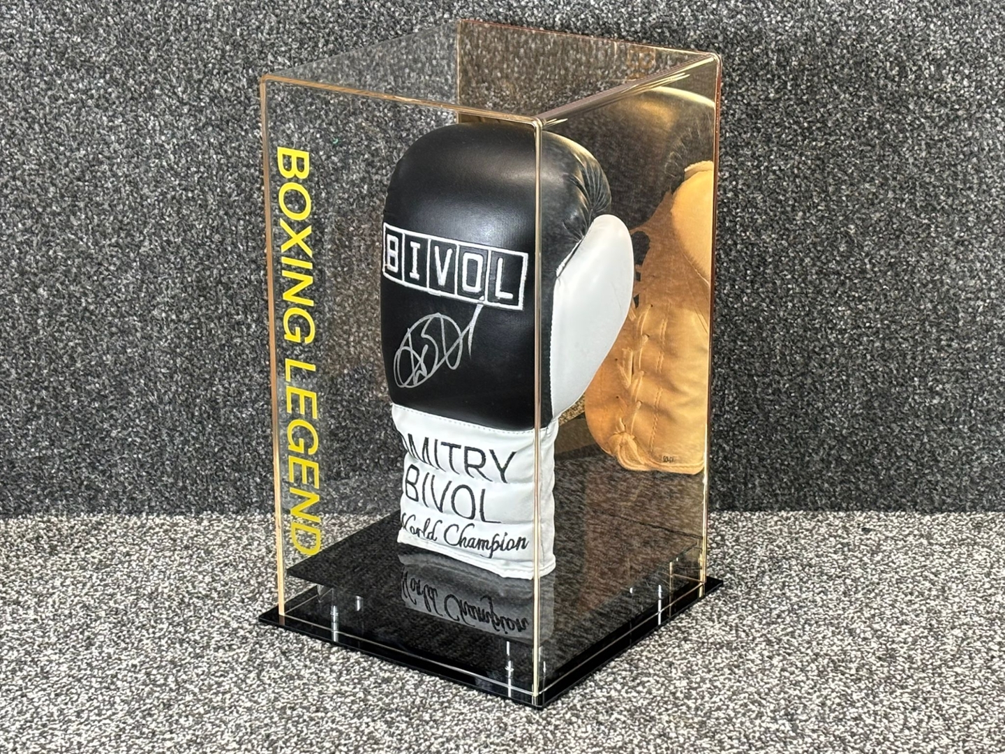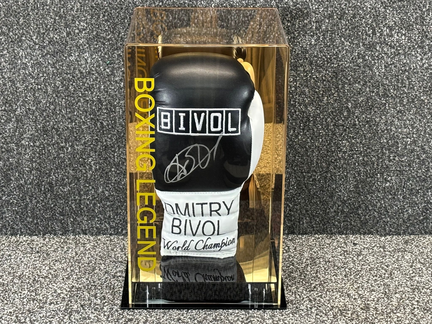 The elegant black glove prominently features Dmitry Bivol’s signature, along with his name and "World Champion" lettering, symbolizing his dominance in the light heavyweight division. The sophisticated design is complemented by the "Boxing Legend" inscription in gold on the display case, adding an element of prestige to this unique item.