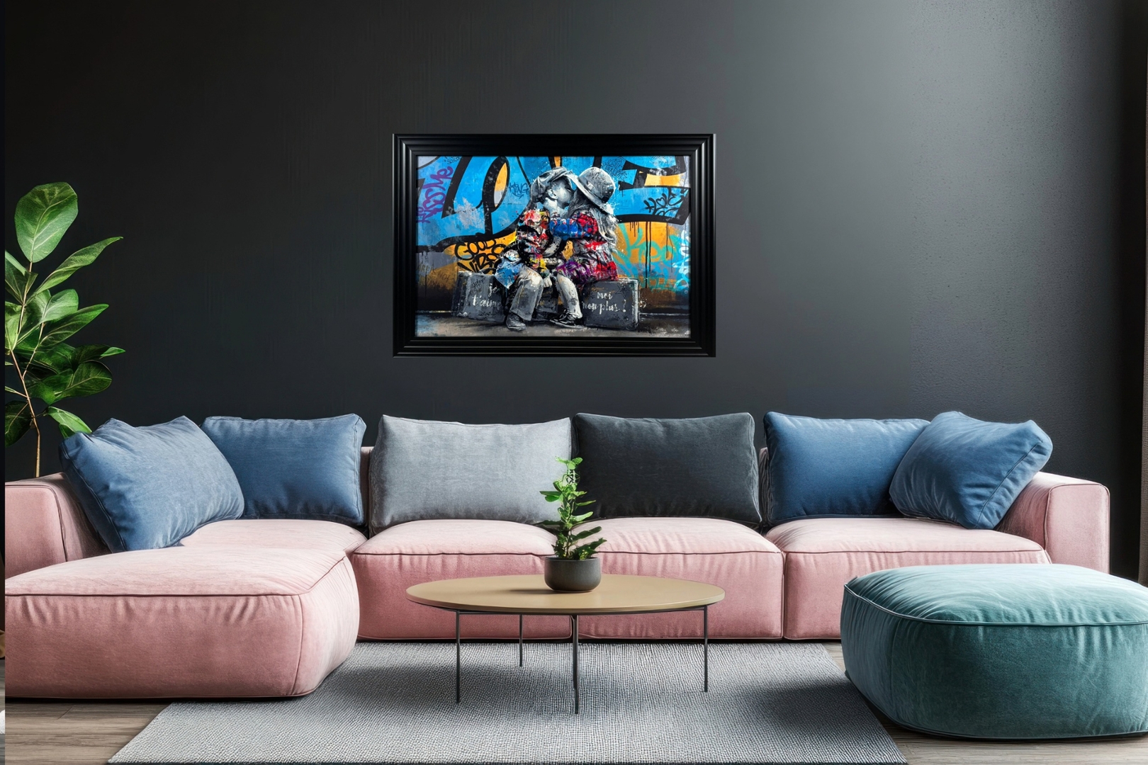 The gritty graffiti background explodes with layers of bold blue, orange, and purple tones, merging the innocence of childhood affection with the rebellious spirit of street art. The children’s clothing is a patchwork of bright colours and textures, standing out vividly against the mural-like surroundings. Framed in sleek black and finished with a high-gloss clear coat overlay, this piece is both tender and bold. Perfect for lovers of contemporary urban art, it’s a striking and emotive addition to any modern interior.
