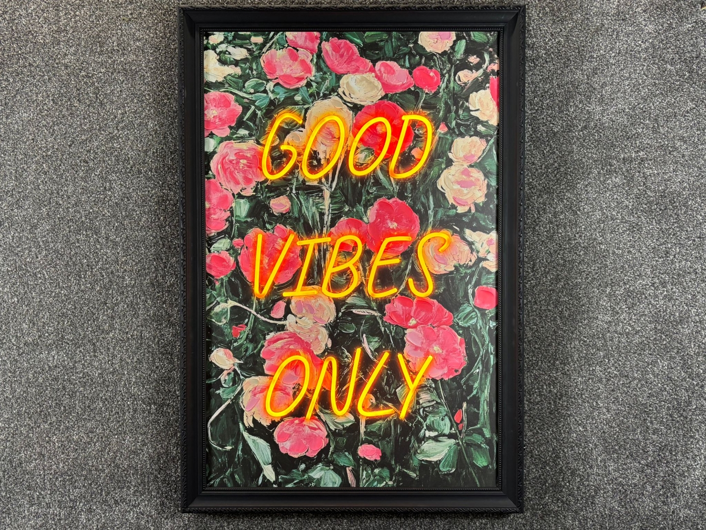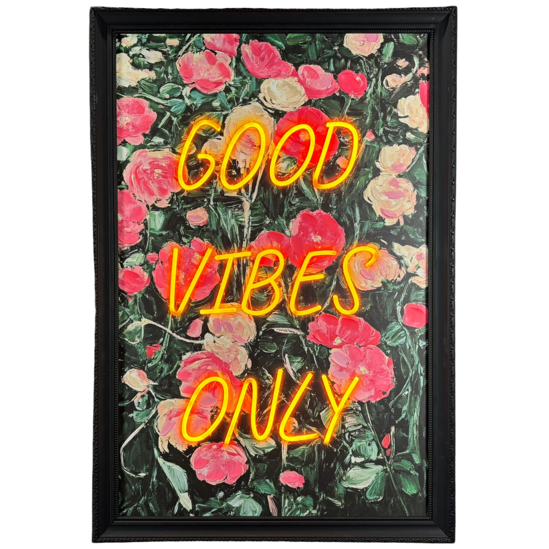 A framed LED wall art piece that radiates positivity, this vibrant design proudly displays the glowing message “Good Vibes Only” in neon-style illumination. Set against a lively floral backdrop of bold pink and red roses, the artwork combines the softness of painterly blooms with the energetic glow of LED lighting, creating a striking contrast that immediately lifts the atmosphere of any room.