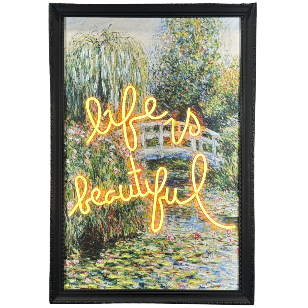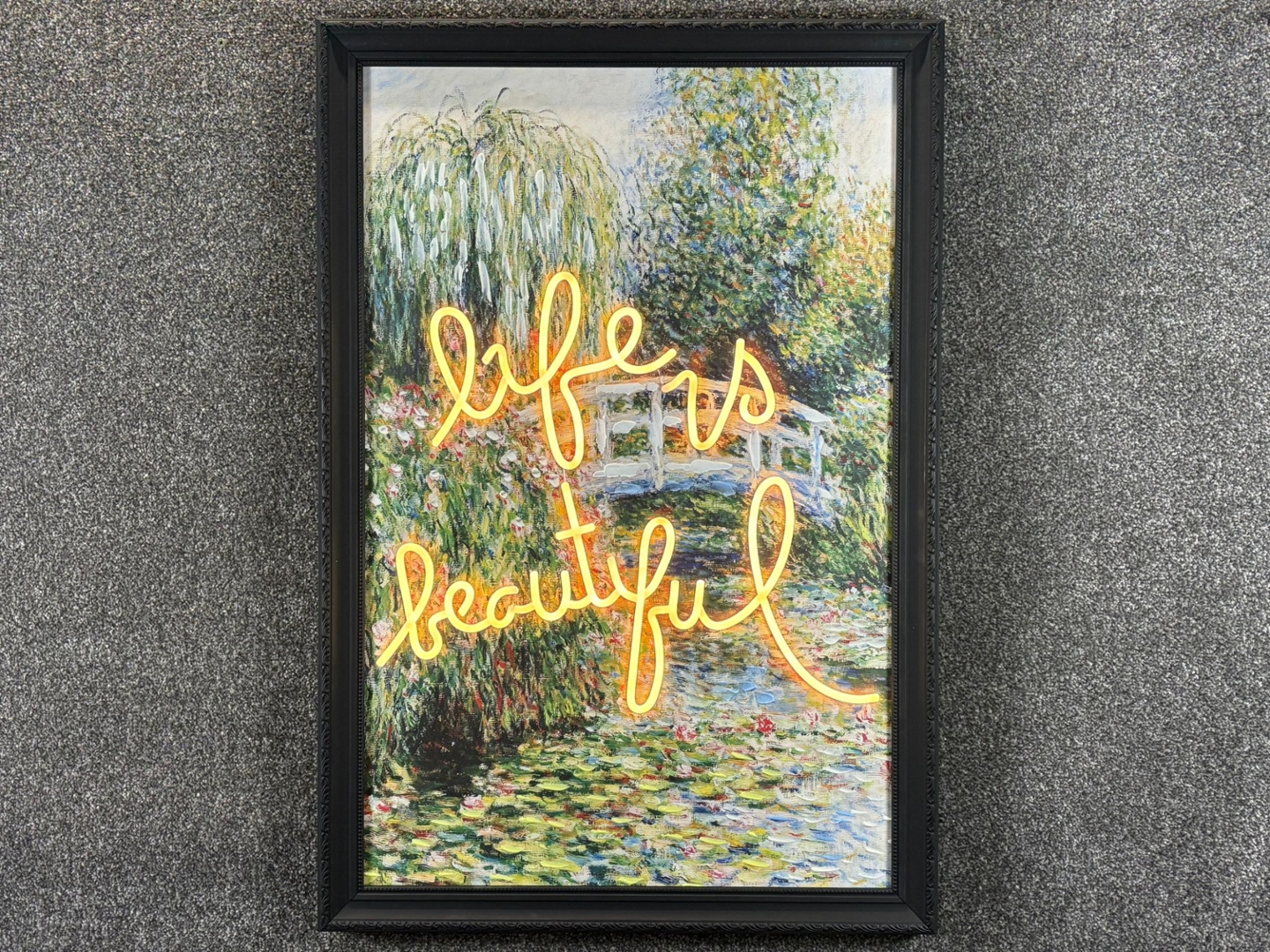 A framed LED wall art combines timeless artistry with modern flair, creating a truly captivating statement piece. Featuring the words "Life is Beautiful" illuminated in warm neon-style LED, the artwork overlays a serene impressionist-inspired garden scene complete with lush greenery, a charming footbridge, and a tranquil lily pond. The combination of soft brushstroke imagery with glowing contemporary lettering produces a contrast that is both uplifting and eye-catching.