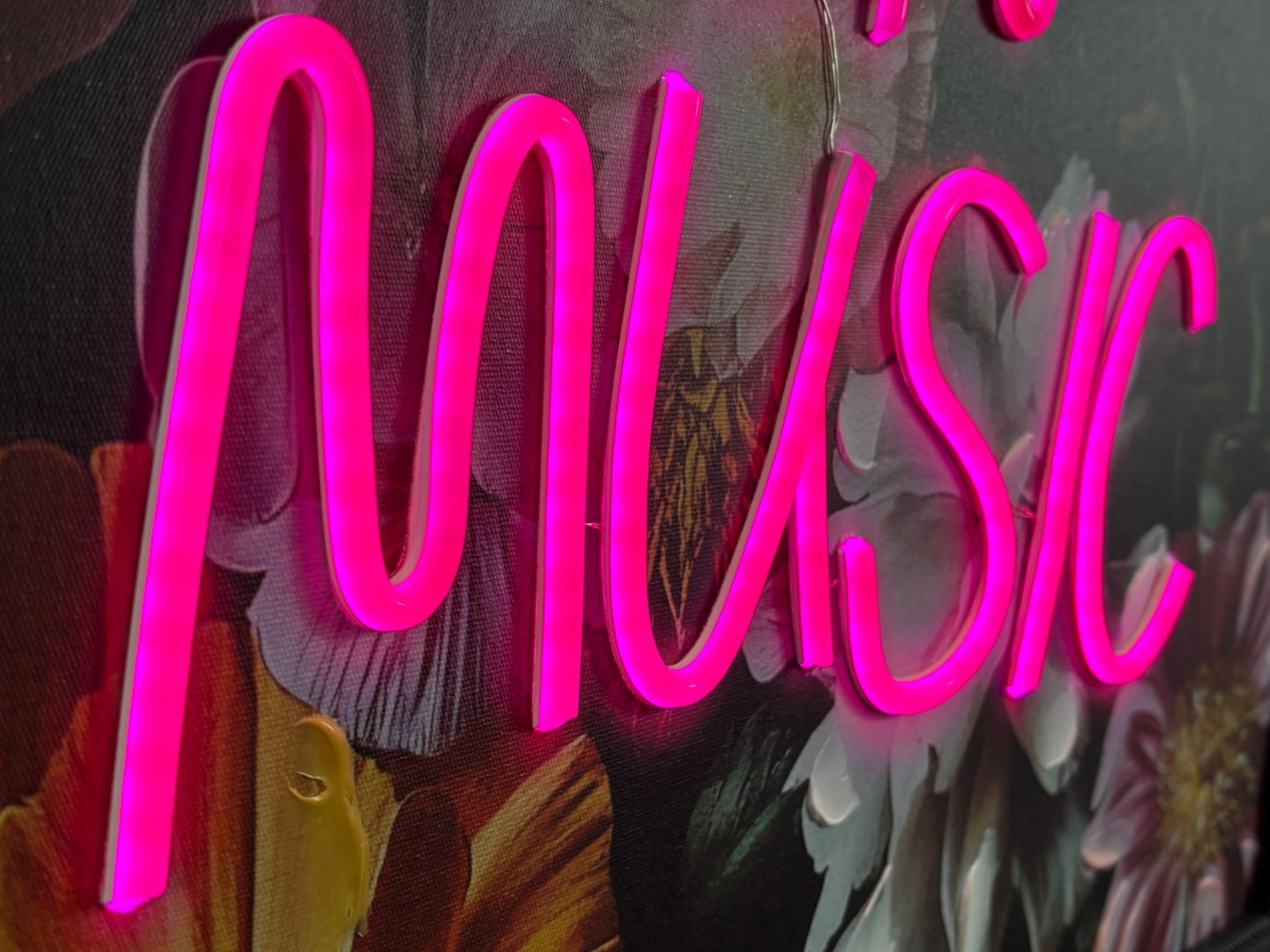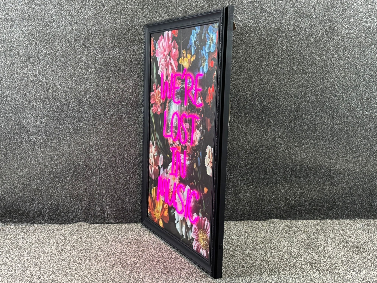 A framed LED wall art piece that celebrates creativity and rhythm, this stunning design features the glowing phrase “We’re Lost In Music” in bold neon pink. The words are set against a dazzling disco ball surrounded by a dramatic arrangement of richly colored flowers, blending the vibrancy of nightlife with the elegance of classic floral art. The result is a striking fusion of modern energy and timeless beauty.