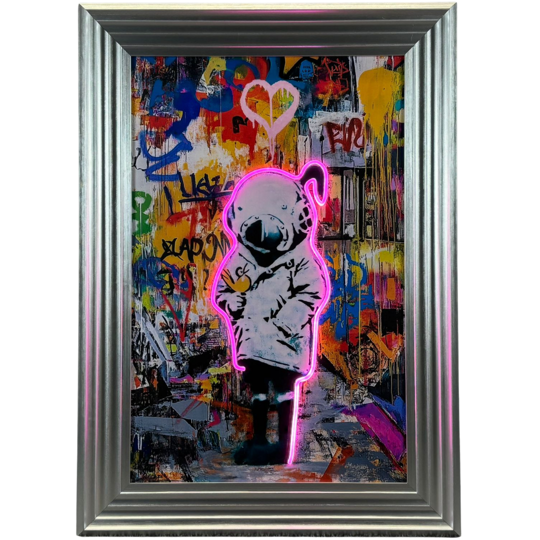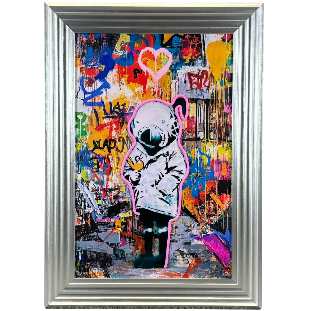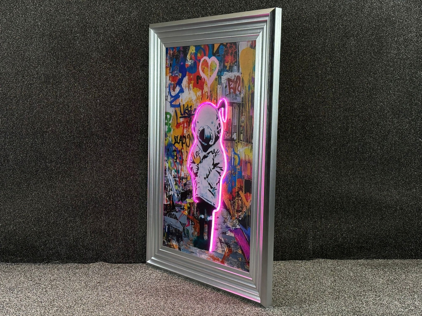 - > Framed LED Wall Art Banksy Picture of a Graffiti Space Girl & Bird