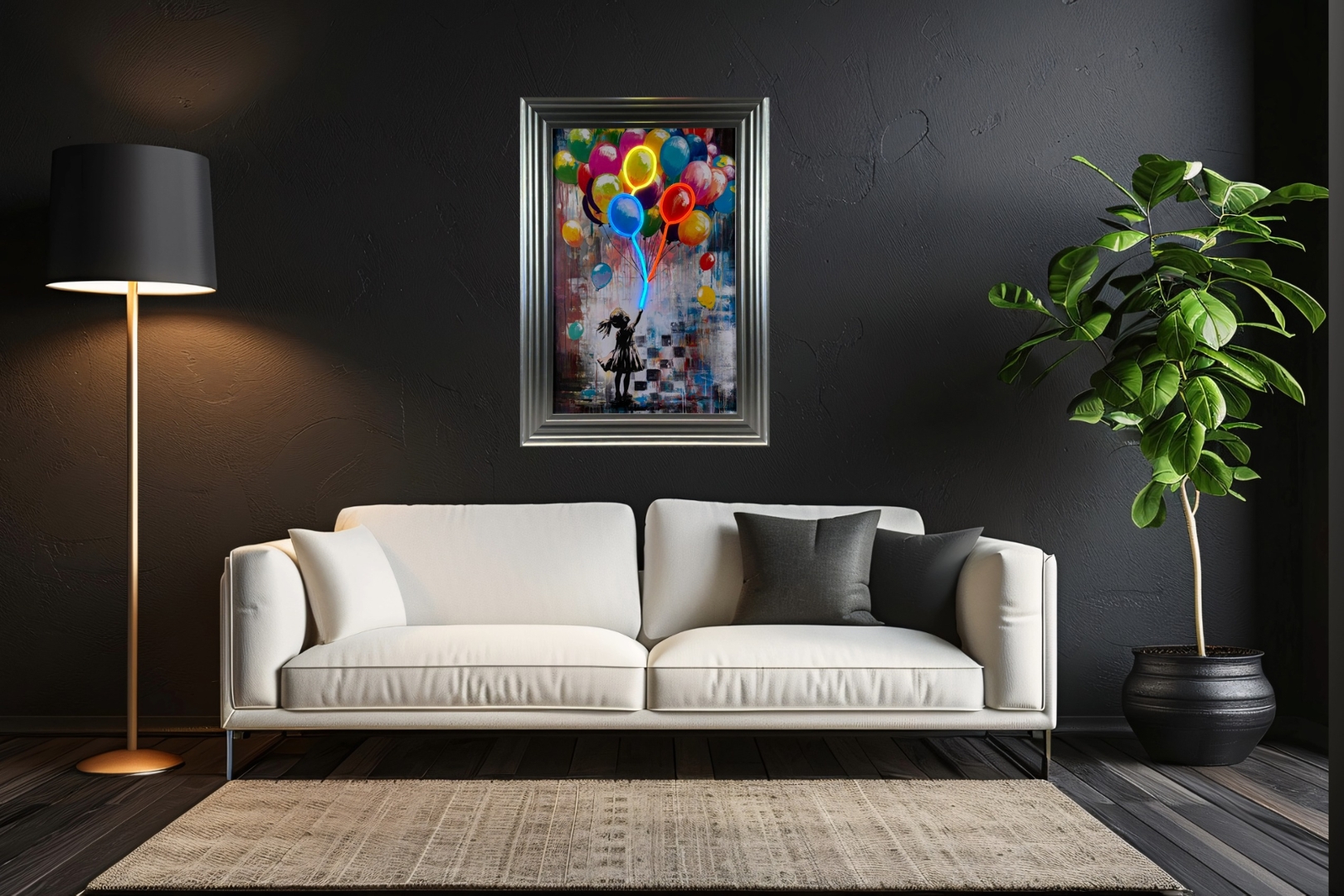 A brand new silver framed LED wall art picture showcasing a vibrant scene of a girl reaching up toward a colourful cluster of balloons. The artwork blends graffiti textures, expressive brushwork, and bold drips of colour to create a lively, modern street-art aesthetic. The integrated LED lights illuminate selected balloons in bright neon tones, adding depth, energy, and a dynamic glow that instantly transforms the piece when switched on. As a rule, these LED artworks look fantastic with the lights both on and off, offering versatility for any interior.