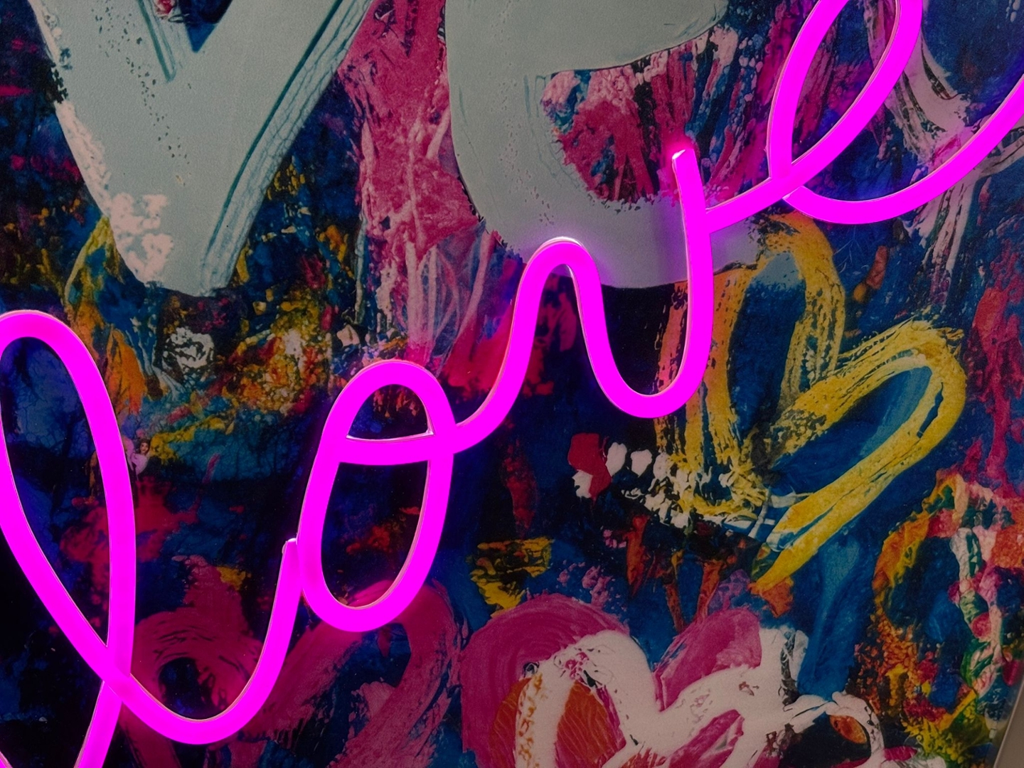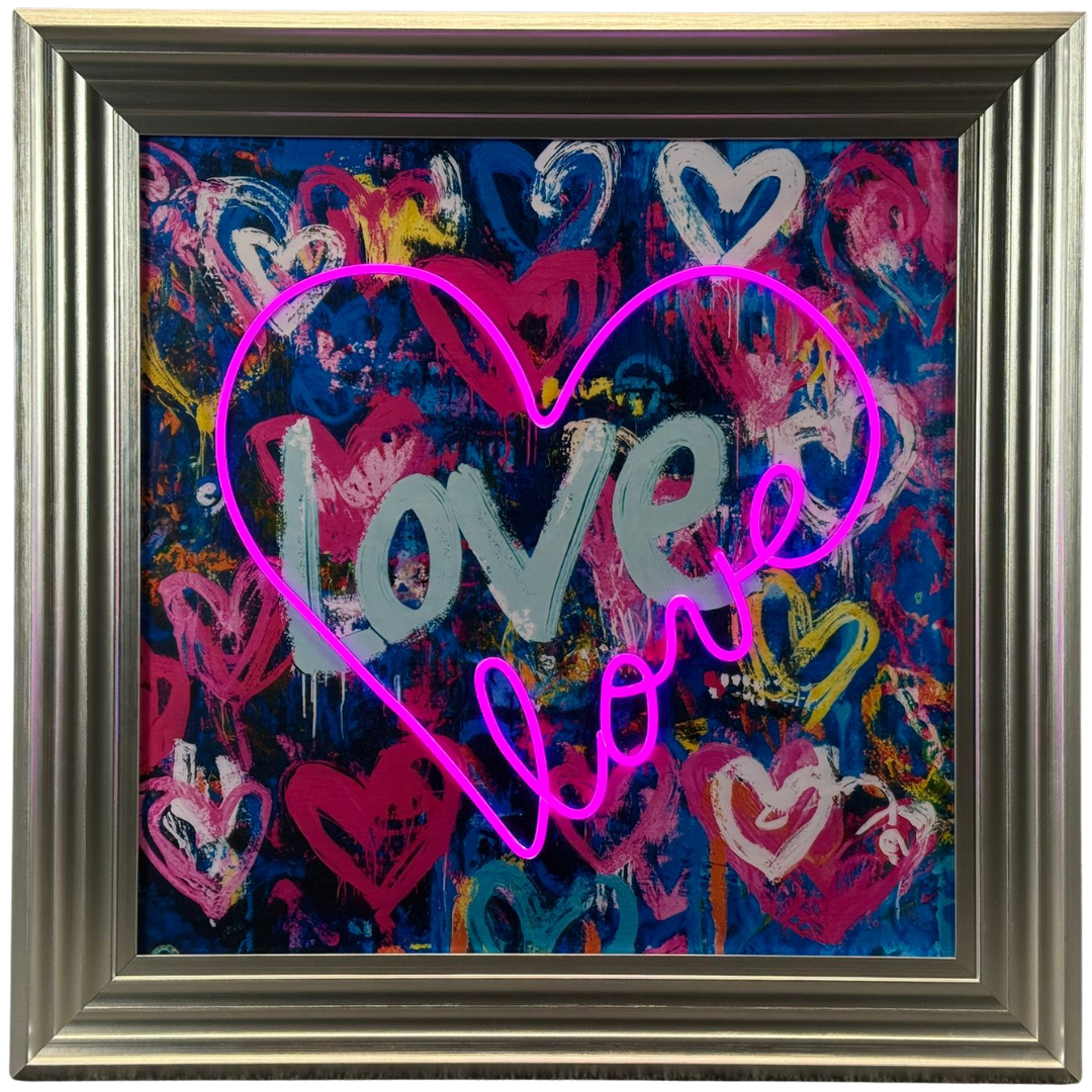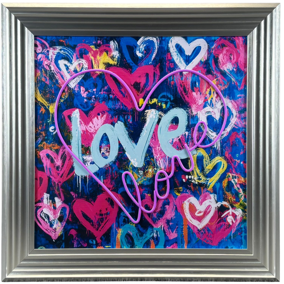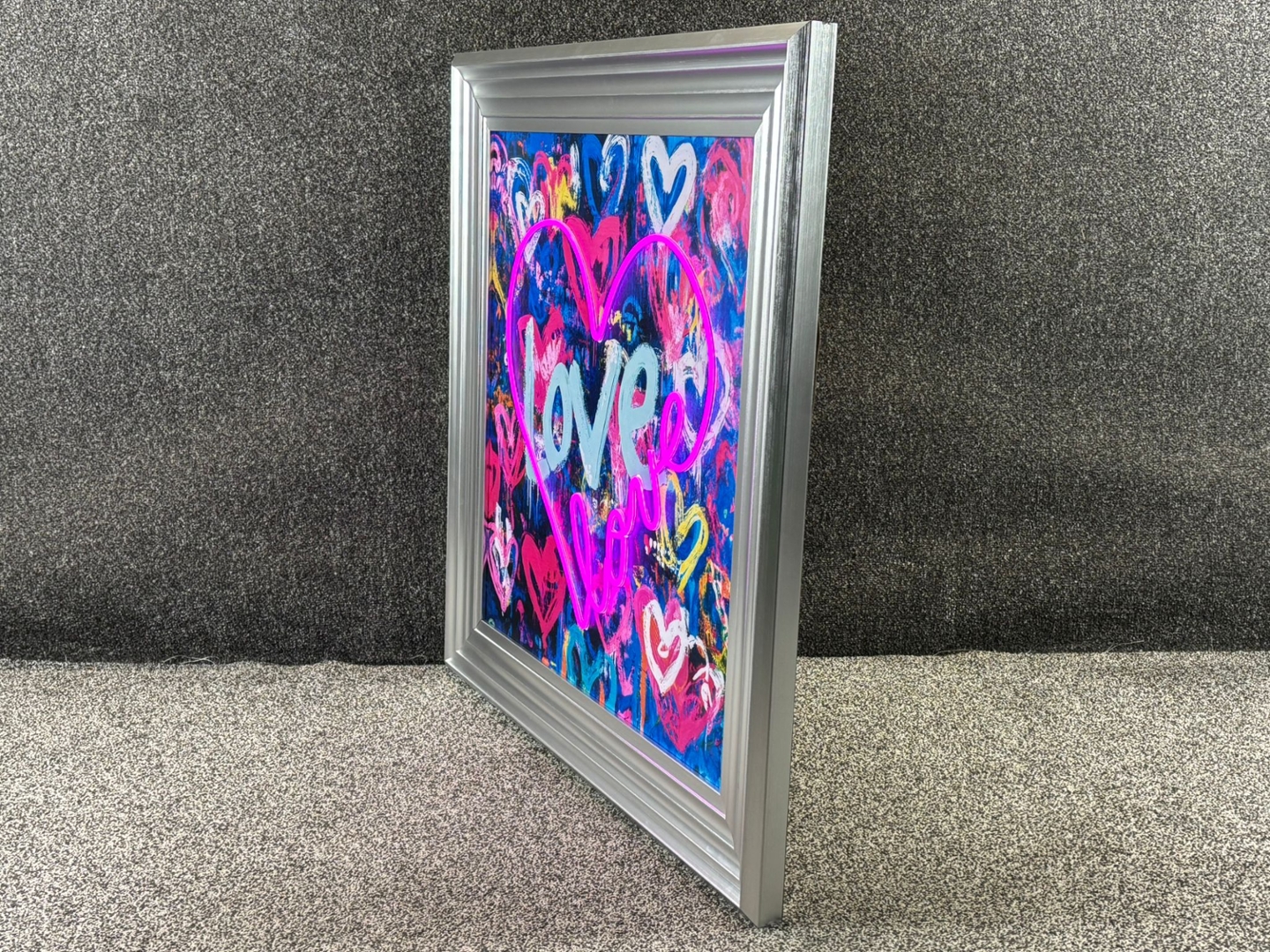 A brand new silver framed LED wall art picture of Love Hearts. This picture features a power button at the bottom and a battery pack.