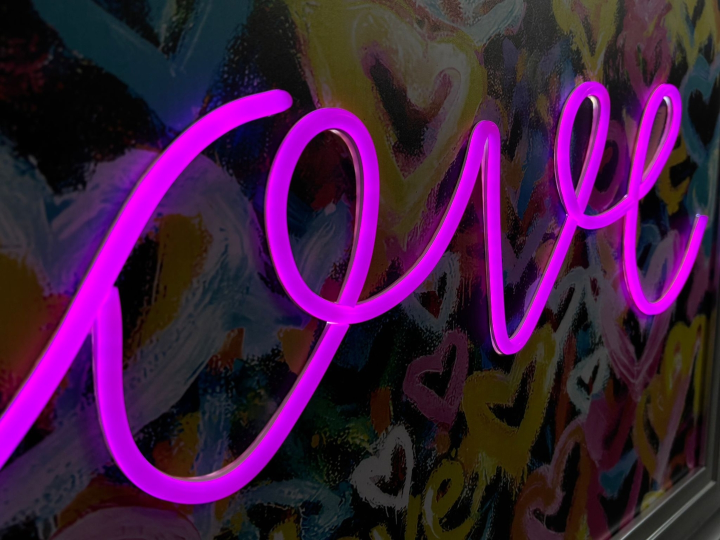 word “love” is illuminated in bright pink LED tubing,