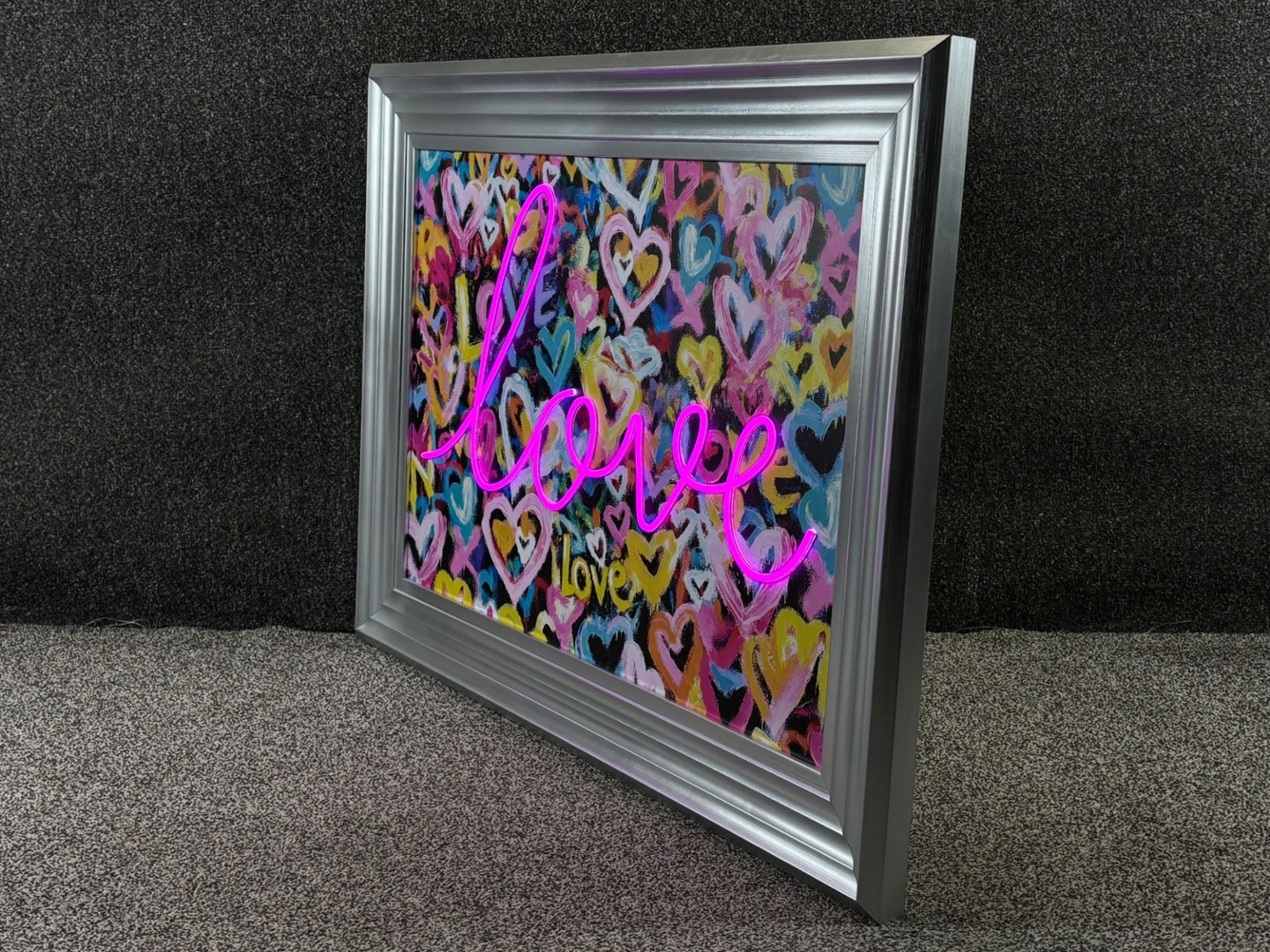 A brand new silver framed LED wall art picture titled Love is an