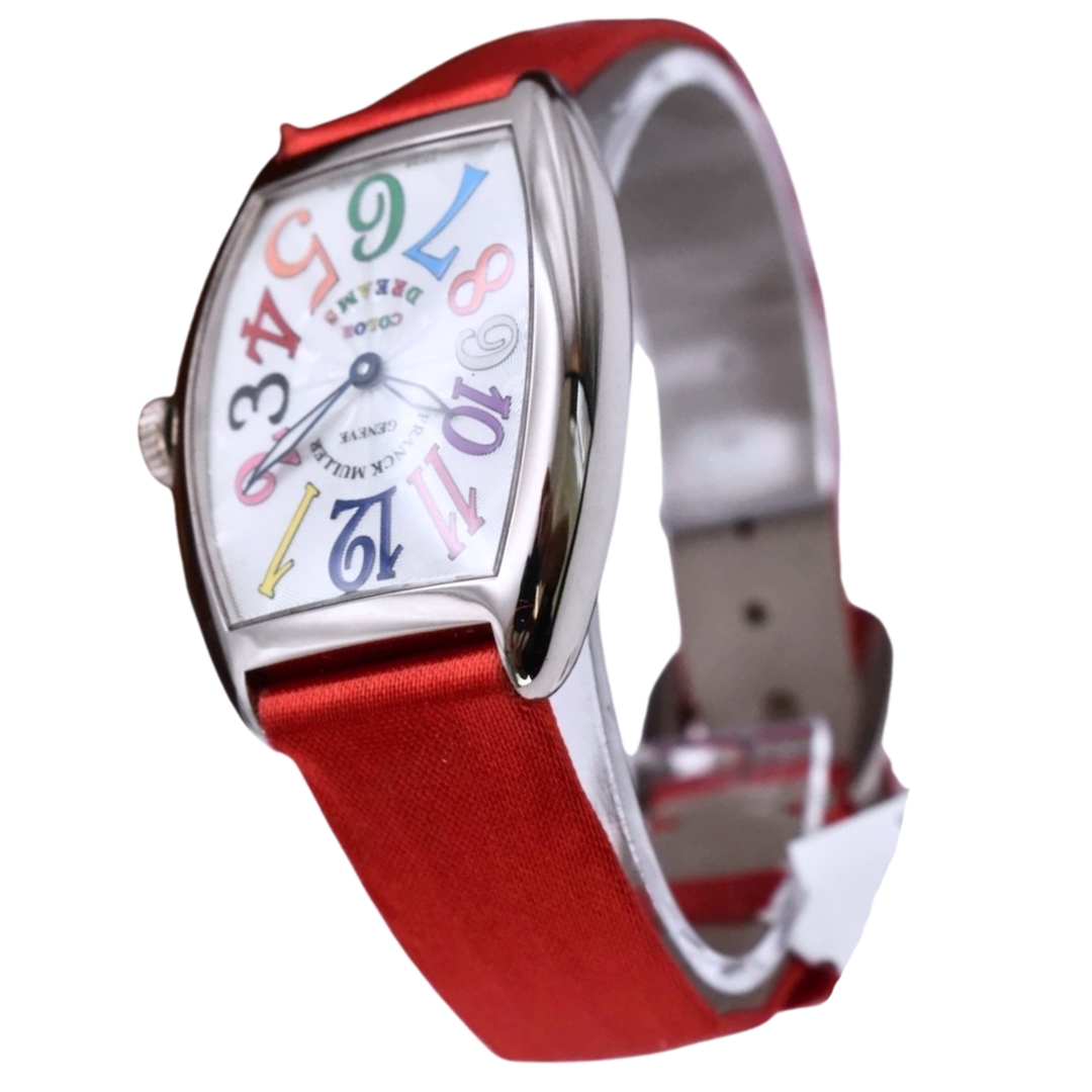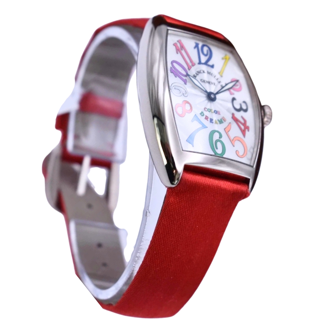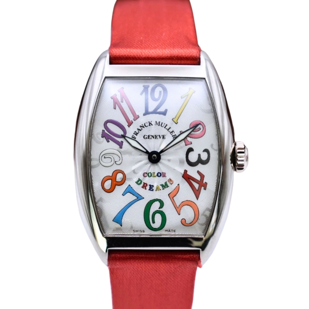 A Franck Muller Colour Dreams Watch presented on a striking red satin strap with a refined white metal case, showcasing one of the brand’s most playful and recognisable dial designs. The silver guilloché dial is decorated with vibrant multi-coloured Arabic numerals, arranged across the signature Cintrée Curvex case shape that has become synonymous with Franck Muller’s distinctive watchmaking style.