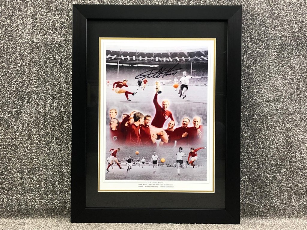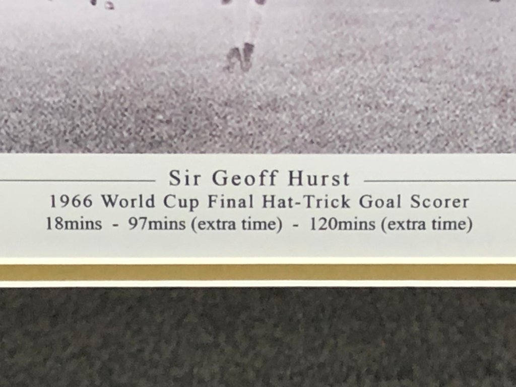 A signed and authenticated Geoff Hurst England World Cup 1966 picture in a presentation frame. Approx 22" height, 18" width.