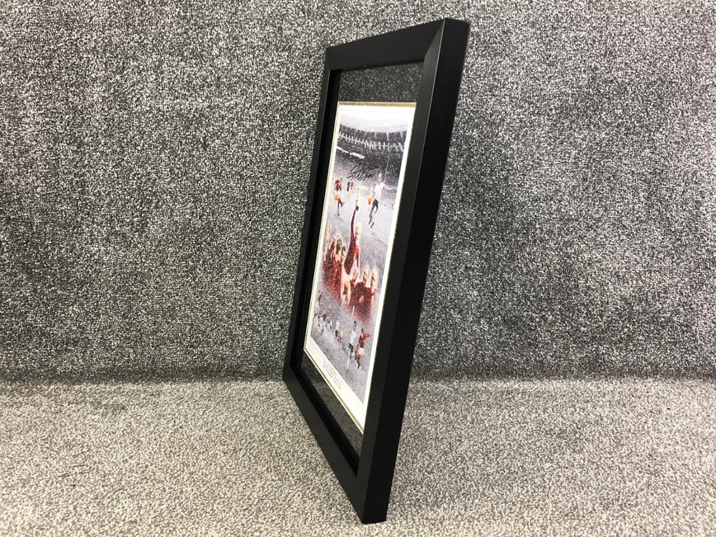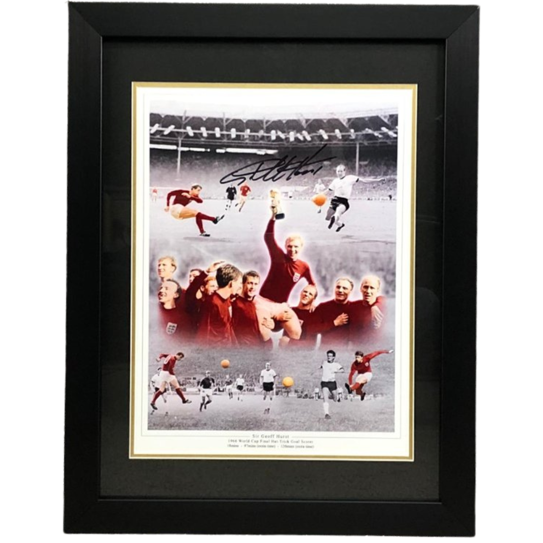The image captures a montage of iconic moments from that unforgettable match, with England’s triumph brought to life through a blend of action shots and celebratory scenes. Hurst’s signature is clearly displayed across the photograph, adding authenticity and enhancing its appeal as a collector’s piece. The composition and colour accents draw attention to the defining moments of the final, making it visually engaging and instantly recognisable.