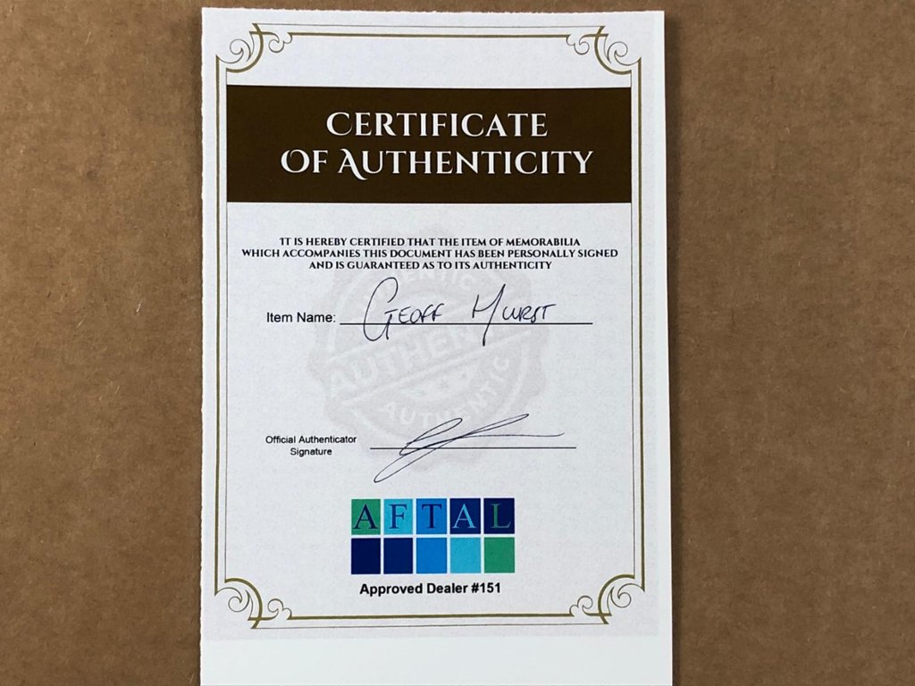 A signed and authenticated framed photograph celebrating Geoff Hurst and his legendary performance in the 1966 FIFA World Cup Final. Forever etched in football history, Hurst remains the only player to score a hat-trick in a World Cup final, securing England’s historic victory at Wembley and cementing his place among the game’s greatest names.