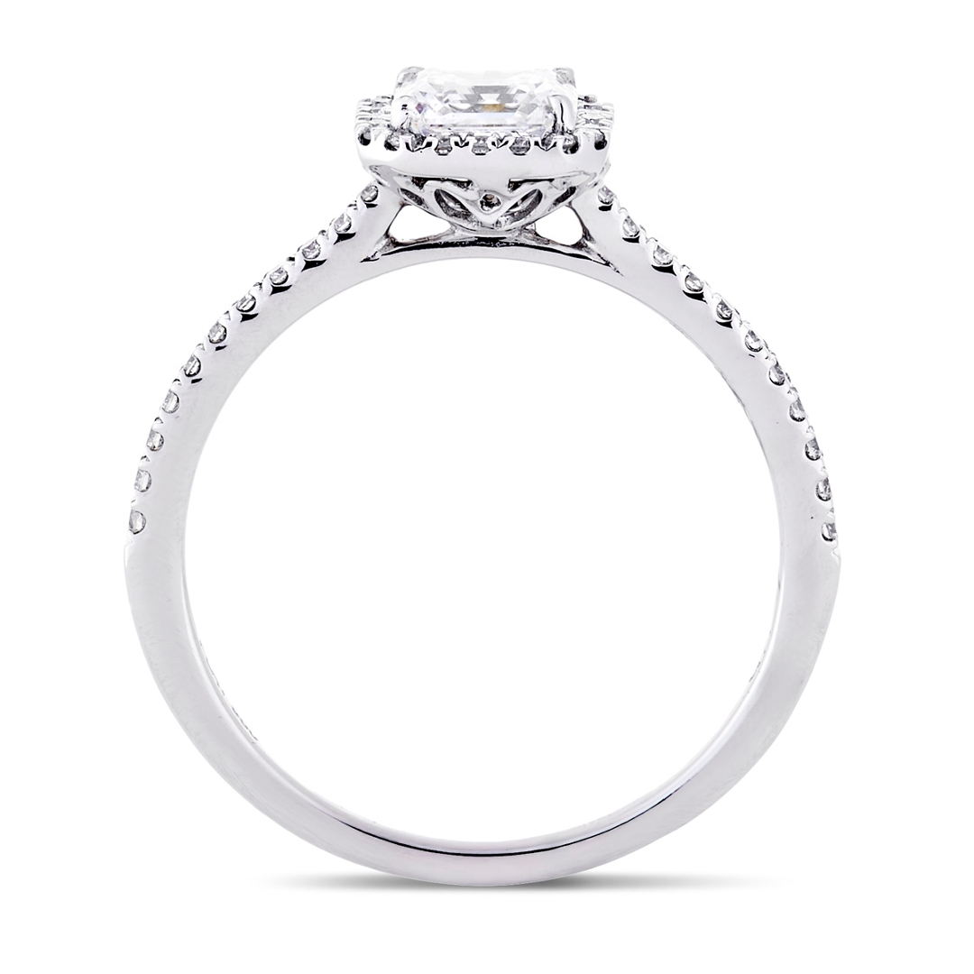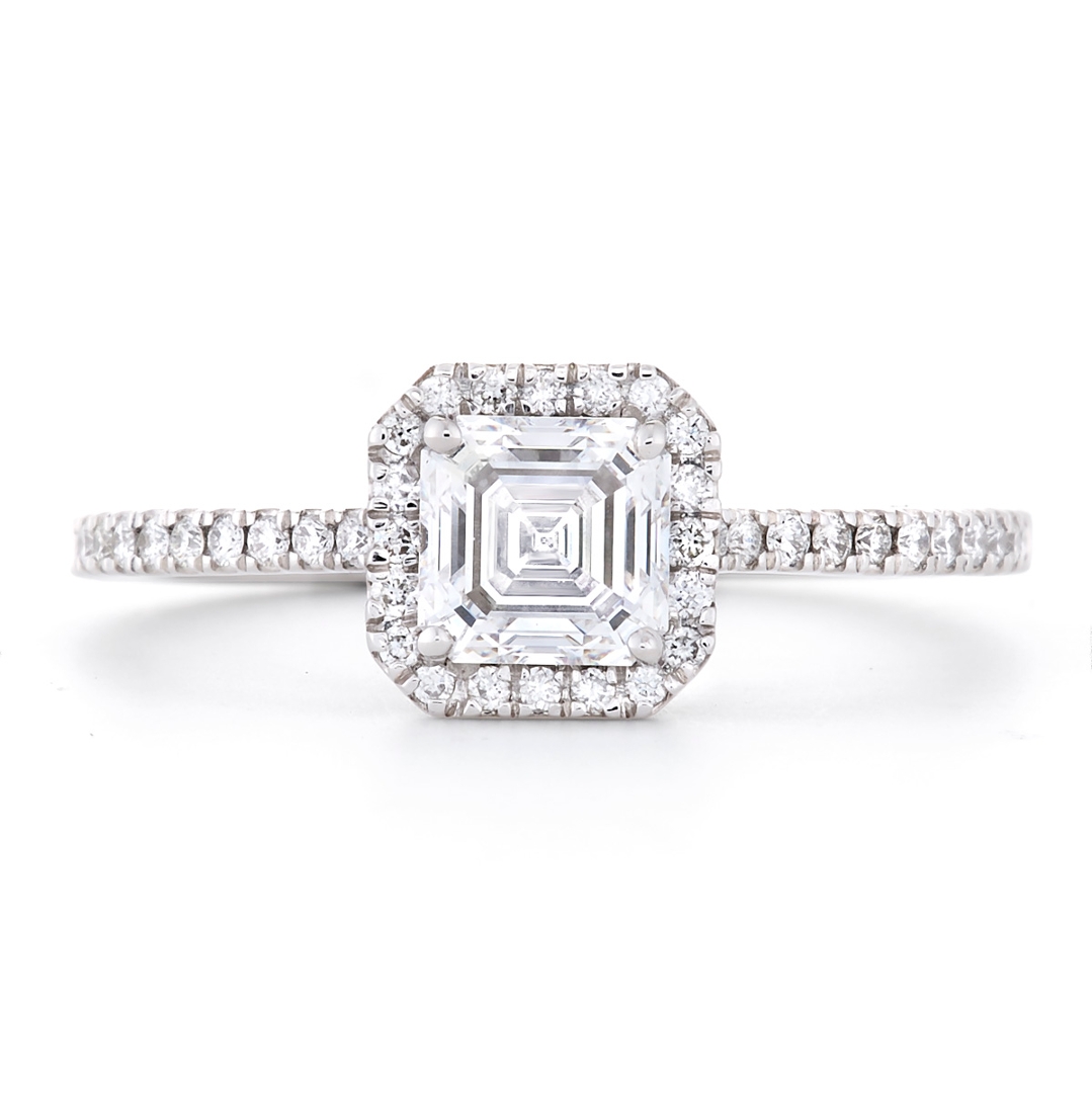 Surrounding the centre stone is a finely set halo of brilliant-cut diamonds, designed to enhance the Asscher cut’s striking geometry while adding a radiant frame of light. The sparkle continues down the shoulders, where additional brilliant-cut diamonds are intricately set for a seamless, flowing design. These accent stones total 0.12 ct. They are graded F-G in colour and VS1-VS2 in clarity, offering a high-quality finish and refined brilliance that perfectly complements the central stone.