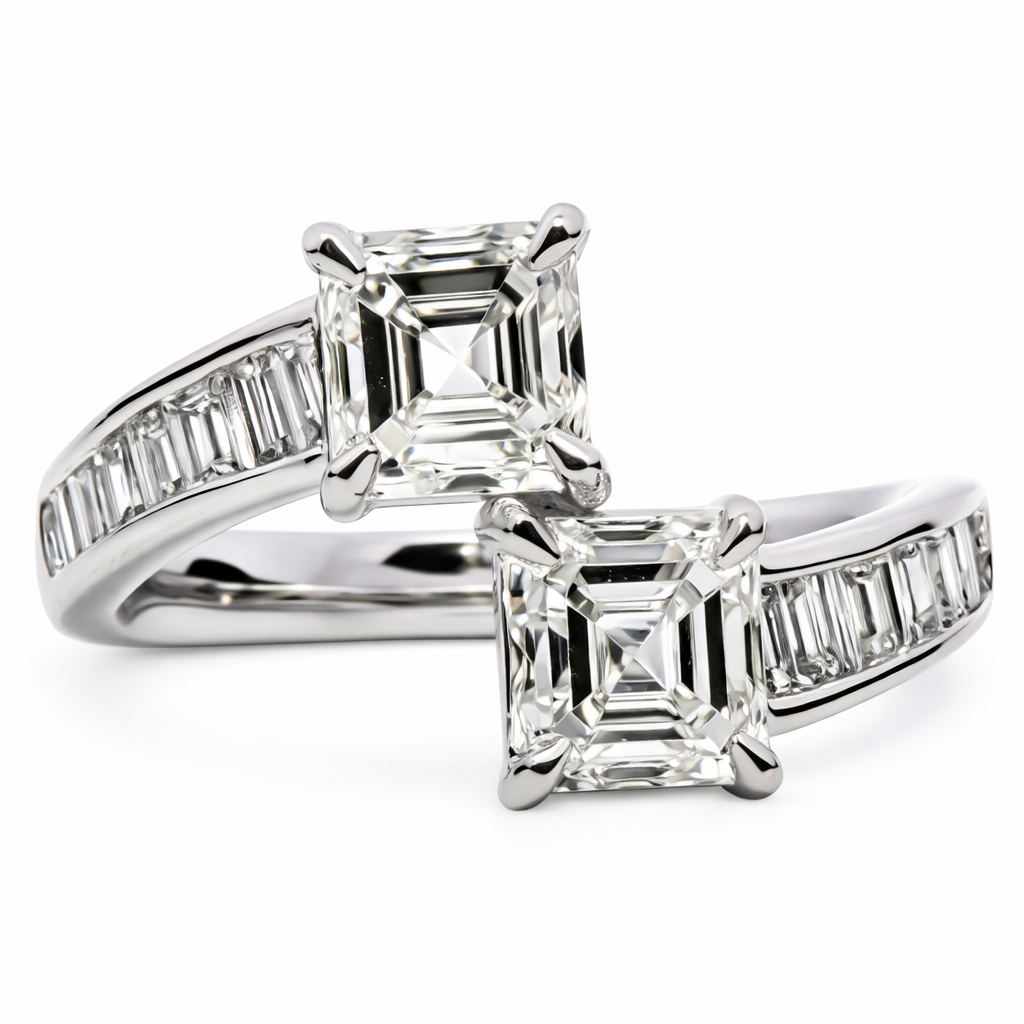 A brand-new, unused GIA-certified natural diamond toi et moi cluster ring, centred with two Asscher-cut diamonds and complemented by a cluster of baguette-cut diamonds to the shoulders, all set in platinum. The principal stones, with a combined weight of 1.81 ct, showcase the distinctive step-cut geometry of the Asscher cut, admired for its depth, symmetry, and elegant, mirror-like reflections. The toi et moi design adds a layer of meaning and visual balance, while the structured baguette accents provide a refined contrast that enhances the overall composition.