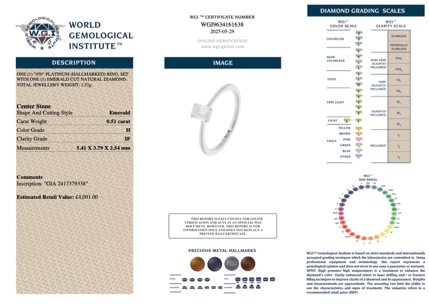 A brand-new, unused GIA-certified platinum diamond engagement ring that exudes pure elegance and refined simplicity. A striking 0.51ct emerald-cut natural diamond is at its centre, expertly graded H for colour and IF (Internally Flawless) for clarity—a scarce combination. With its crisp step-cut facets and clean lines, the emerald cut reveals the diamond’s extraordinary clarity and depth, offering an incredible, sophisticated sparkle that sets it apart from traditional cuts.