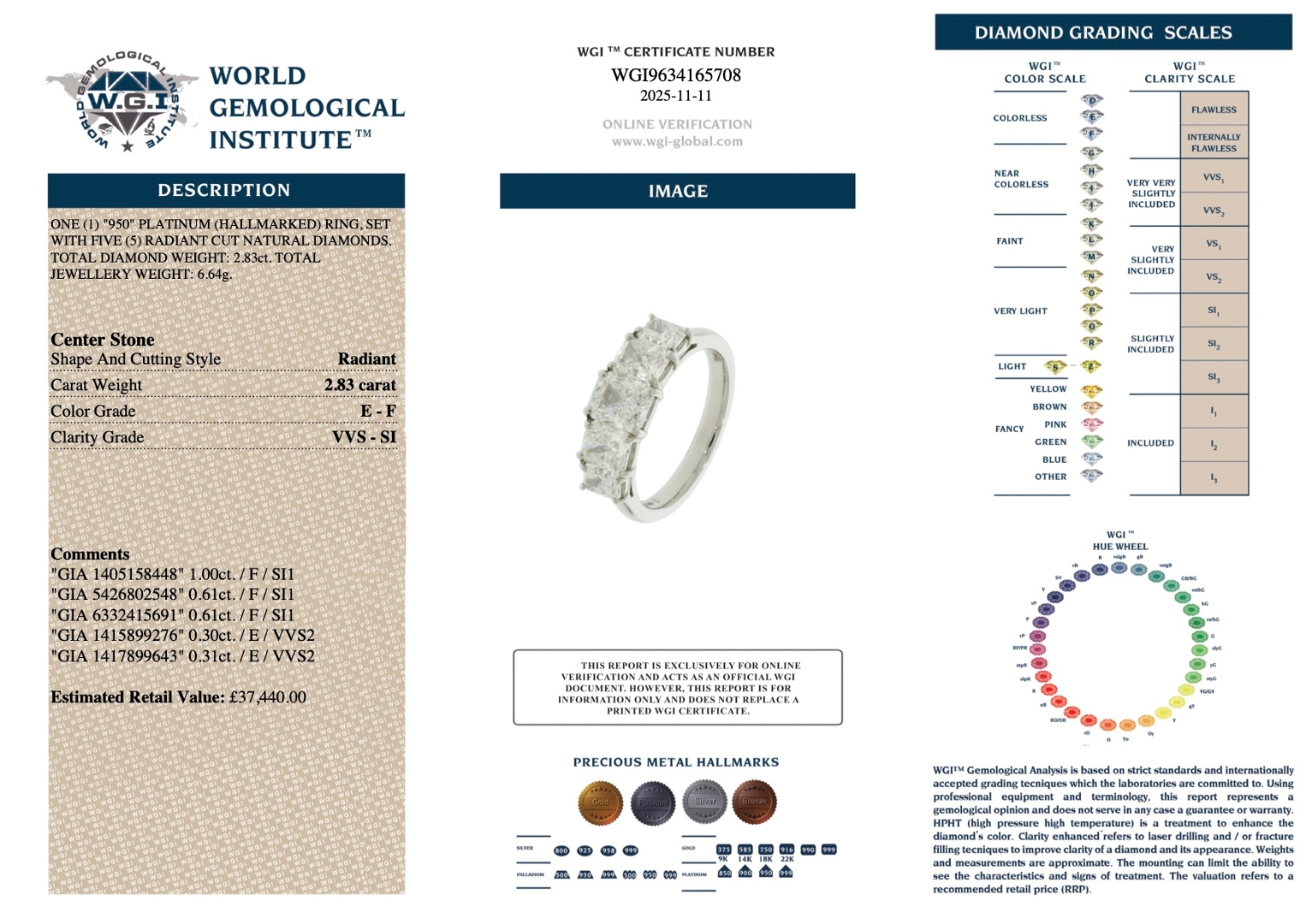 A brand-new, unused GIA-certified natural diamond five-stone cluster ring that showcases refined brilliance, exceptional clarity and a timeless sense of luxury. Set with five radiant-cut natural diamonds totalling 2.83ct in outstanding E–F colour and VVS–SI clarity, the ring delivers an impressive play of light as each stone reflects crisp flashes of fire from its precisely faceted shape. The radiant cut offers a striking combination of sparkle and structure, giving the design a modern yet enduring elegance that stands out beautifully on the hand. These natural diamonds carry strong appeal for collectors, as earth-formed stones continue to be admired for their rarity, authenticity and long-standing desirability in fine jewellery. With natural diamond supply becoming increasingly limited worldwide and high-quality stones remaining in strong demand, pieces set with certified natural diamonds offer meaningful long-term investment potential alongside their immediate aesthetic impact.
