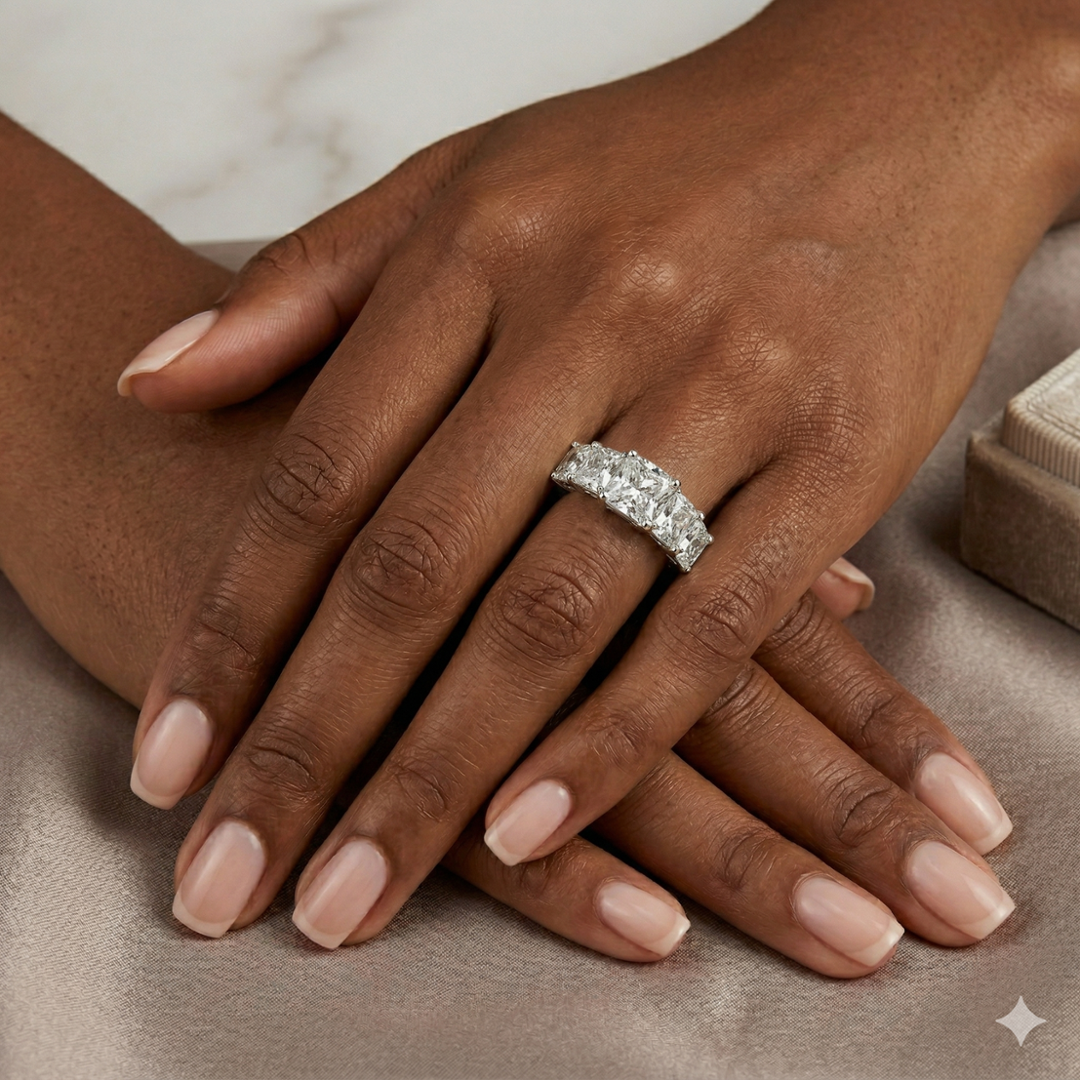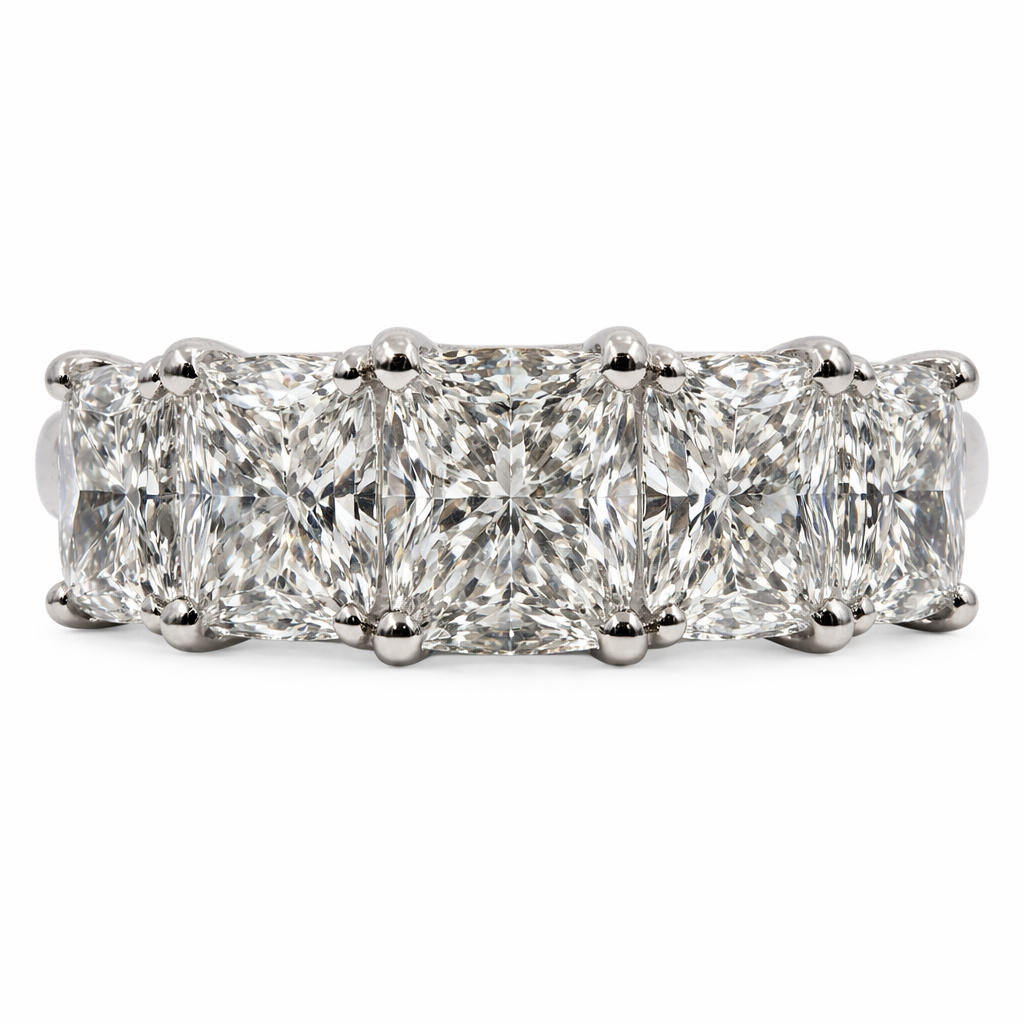 A brand-new, unused GIA-certified natural diamond five-stone eternity ring, set with five radiant-cut diamonds in a finely crafted platinum mount, presenting a total diamond weight of 2.83ct. The radiant cut, admired for its crisp faceting and vibrant light return, offers a striking balance between brilliance and structure, giving each stone a lively yet refined presence. Arranged in a classic five-stone formation, the design provides a continuous display of fire and symmetry across the finger, making it both eye-catching and timeless in its appeal.