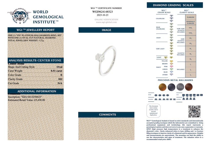 A brand new, unused GIA-certified platinum natural diamond solitaire ring showcasing a radiant oval cut diamond at its centre. Weighing 0.51 carats, this diamond boasts a clarity grade of SI2 and a pristine colour grade of E, emanating timeless elegance and sophistication. Crafted with precision, the platinum setting ensures durability and enhances the diamond's natural brilliance. Weighing 3.27 grams.