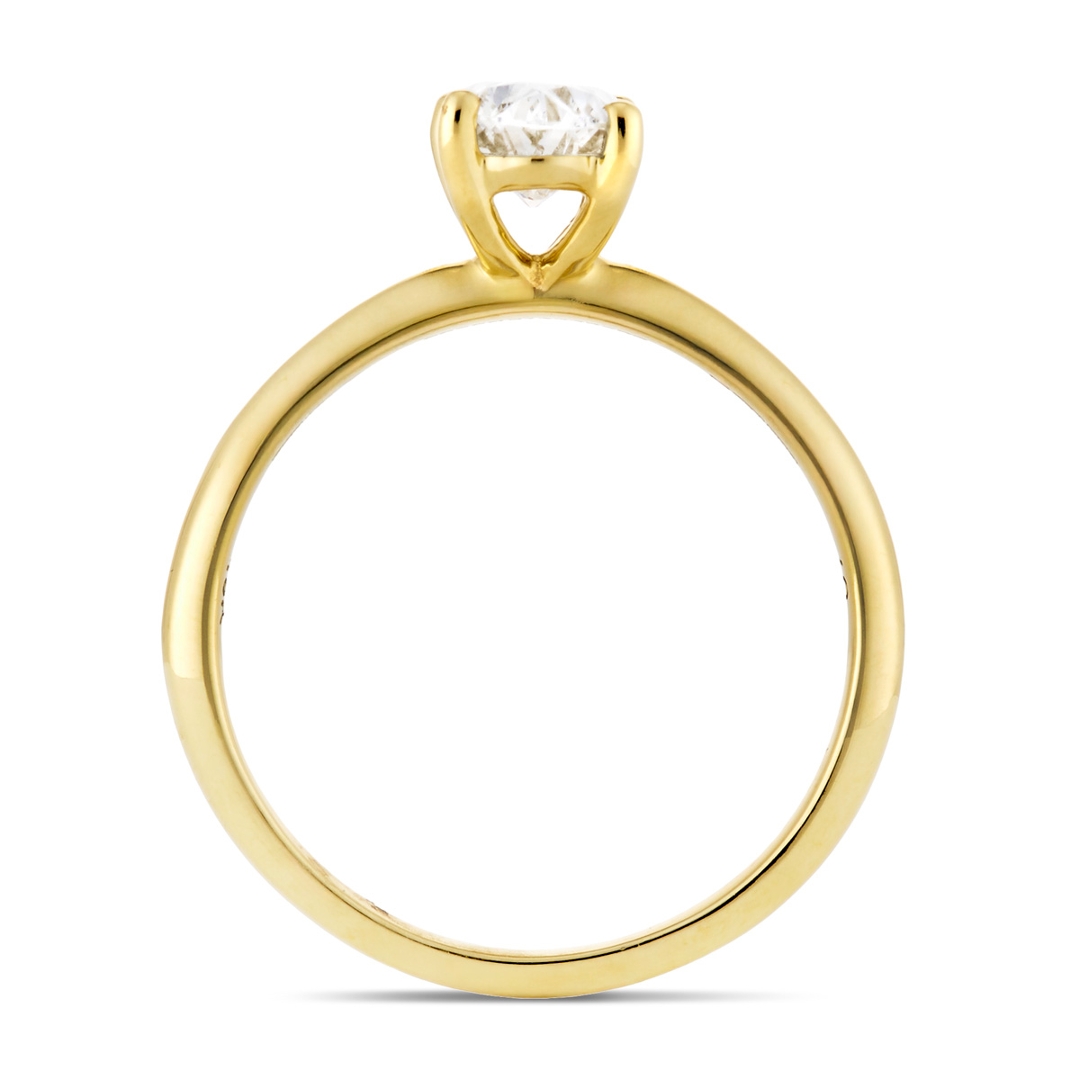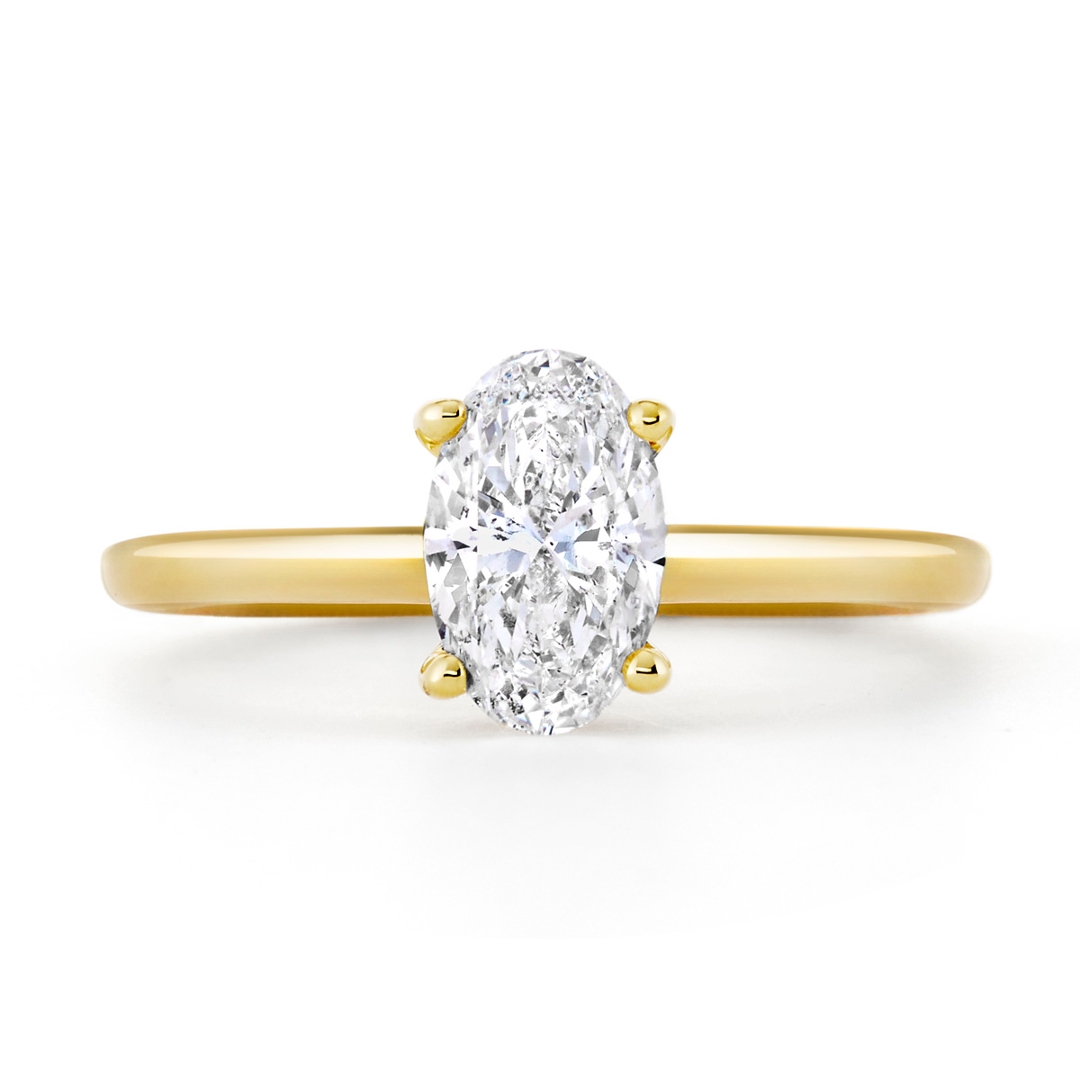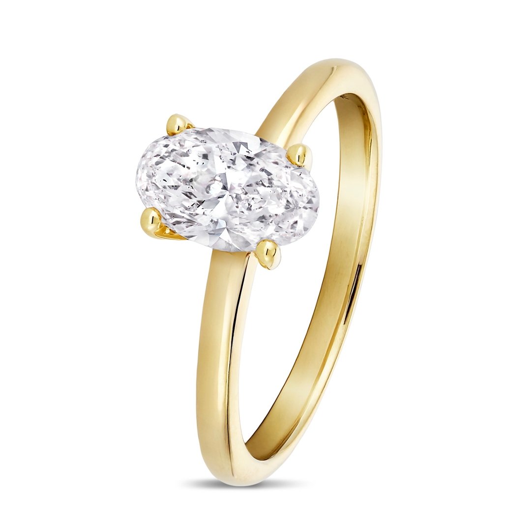 A brand new, unused GIA-certified natural diamond solitaire engagement ring set with one oval-cut diamond at the centre, set in 18ct yellow gold.