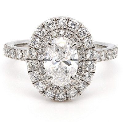 A brand-new, unused, GIA-certified natural diamond solitaire engagement ring, with one oval-cut diamond to the centre & a cluster of brilliant-cut diamonds in a double halo setting & on the shoulders, set in platinum.