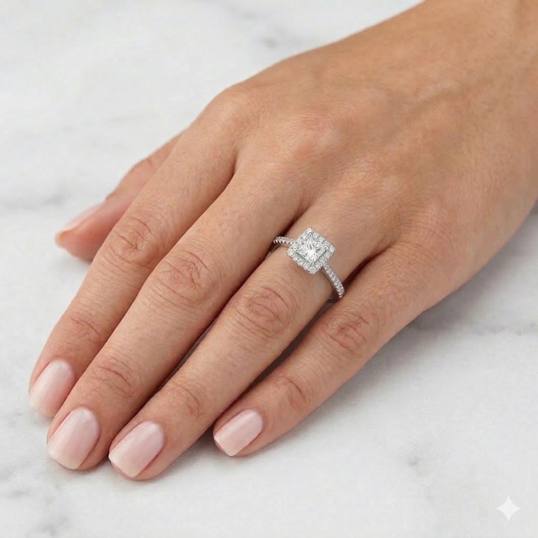 A brand-new, unused GIA-certified platinum engagement ring showcasing a dazzling 0.63ct princess-cut natural diamond at its centre, graded F in colour and VS2 in clarity. The central diamond is surrounded by a halo of natural brilliant-cut diamonds and further enhanced by additional diamonds adorning the shoulders, totalling 0.35ct. The crisp geometry of the princess cut captures light beautifully, while the platinum setting enhances both brilliance and durability, creating a design that is elegant, timeless, and refined.