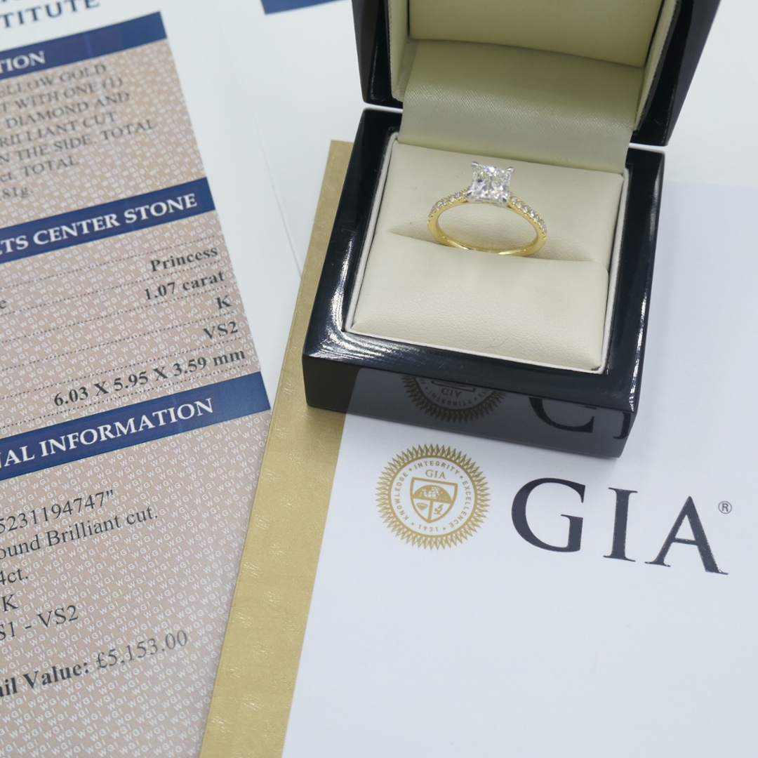 A brand-new, unused GIA-certified 18ct yellow and white gold engagement ring, this elegant piece captures the everlasting allure of natural diamonds. At its centre, a stunning 1.07ct princess-cut diamond rests, displaying VS2 clarity and a warm K colour that shimmers with soft brilliance. The shoulders of the ring are gracefully set with a cluster of brilliant-cut diamonds, totalling 0.24ct, each graded between VS1 and VS2 clarity and J–K colour, enhancing the centre stone with a refined sparkle. The contrasting tones of yellow and white gold create a sophisticated, timeless design that complements the natural beauty of the rocks.