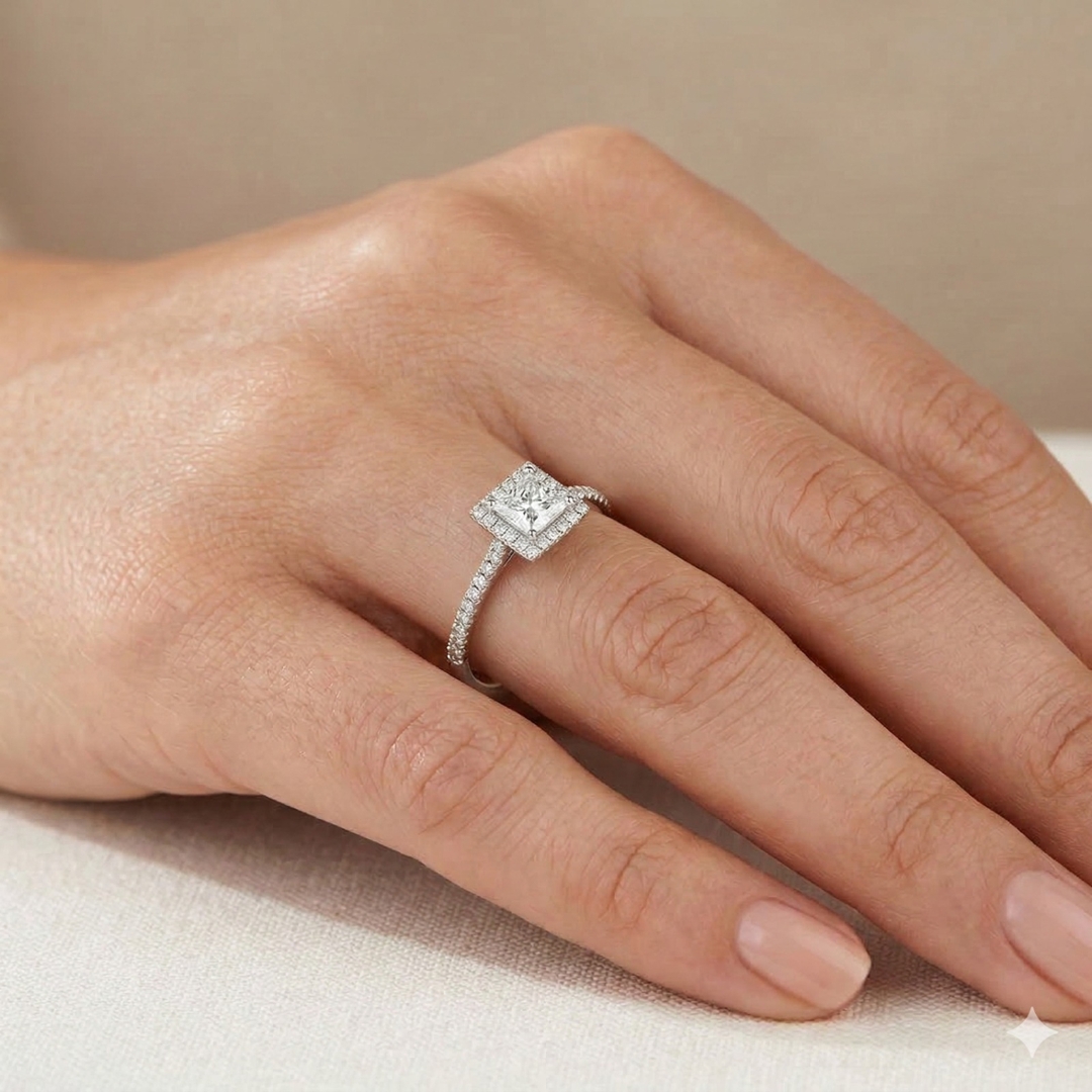 A brand-new, unused GIA-certified natural diamond solitaire engagement ring set with one princess-cut diamond at the centre & a cluster of brilliant-cut diamonds in a halo setting on the shoulders, set in platinum.