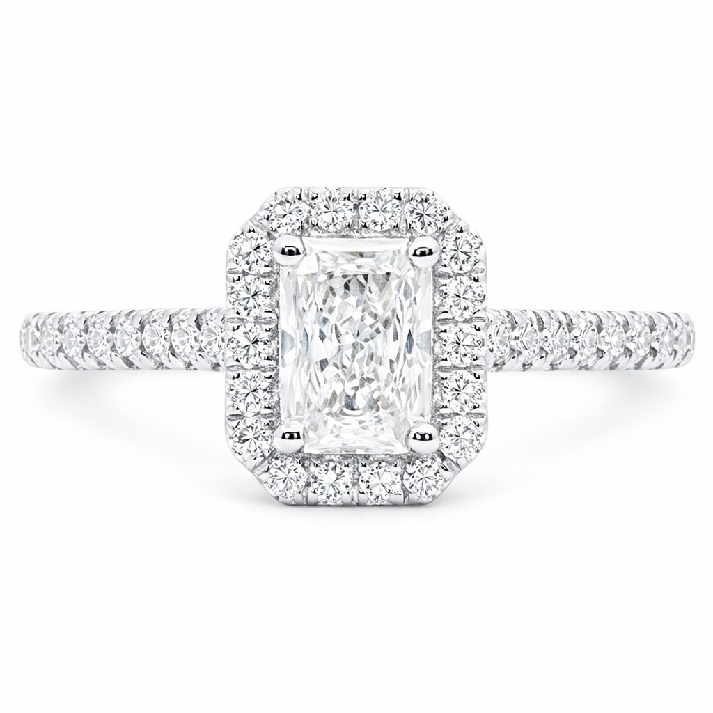 A brand-new, unused natural diamond solitaire engagement ring of refined quality, showcasing a GIA-certified radiant-cut diamond weighing 0.52ct at its centre. Graded VS1 for clarity and H for colour, the diamond presents excellent transparency, lively brilliance, and a balanced appearance that performs beautifully in everyday light. A surrounding halo and shoulder arrangement of brilliant-cut diamonds, totalling 0.27ct, adds definition and presence, creating a cohesive design that feels elegant rather than overstated.