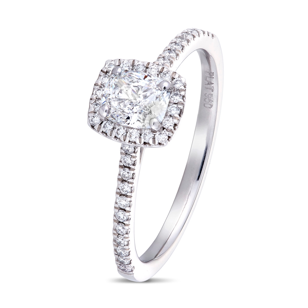 A brand new, unused GIA-certified natural diamond solitaire engagement ring set with one radiant-cut diamond to the centre & a cluster of brilliant-cut diamonds in a halo setting & to the shoulders, set in platinum.