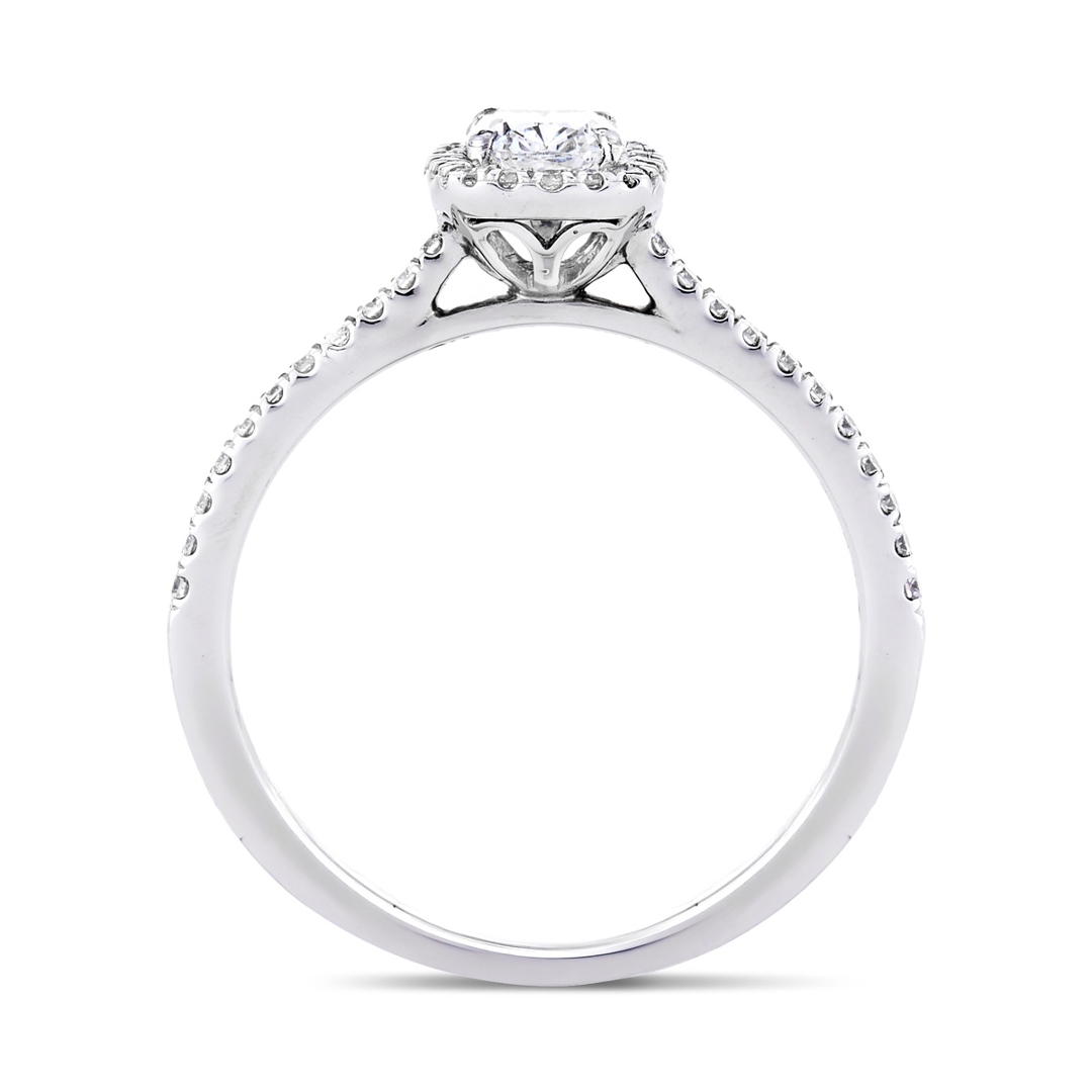 Encircling the radiant centre is a cluster of brilliant-cut diamonds in a halo setting, designed to enhance the overall sparkle and create a sense of depth and glamour. The brilliance continues along the shoulders, where additional diamonds are meticulously set to add further radiance and sophistication. These accent stones, with a combined weight of 0.18ct, are graded F-G for colour and VS2-SI1 for clarity, offering a consistent, elegant sparkle that complements the centre stone beautifully.