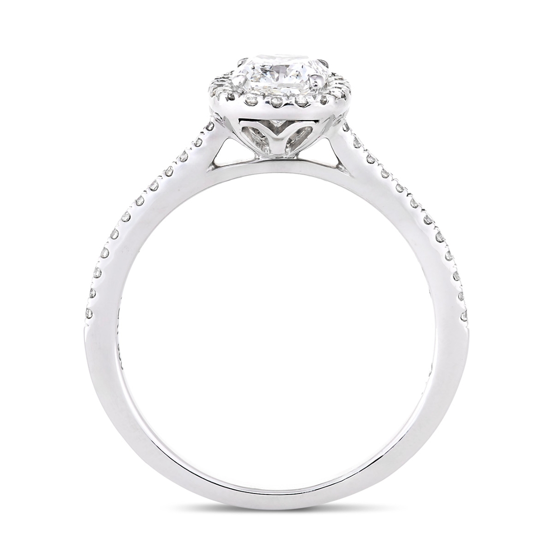 A brand new, unused GIA-certified platinum engagement ring, this stunning piece is a true celebration of natural beauty and refined design. At its heart lies a 0.80ct radiant-cut natural diamond, gleaming with G colour and SI2 clarity, offering impressive fire and brilliance. Surrounding the centre stone is a delicate halo of brilliant-cut diamonds, with additional stones flowing along the shoulders. These accents total 0.18ct and are graded SI1–SI2 clarity and F–G colour, creating a vibrant, light-catching display from every angle. The platinum setting lends a sleek, enduring quality that perfectly complements the sparkle of the diamonds.