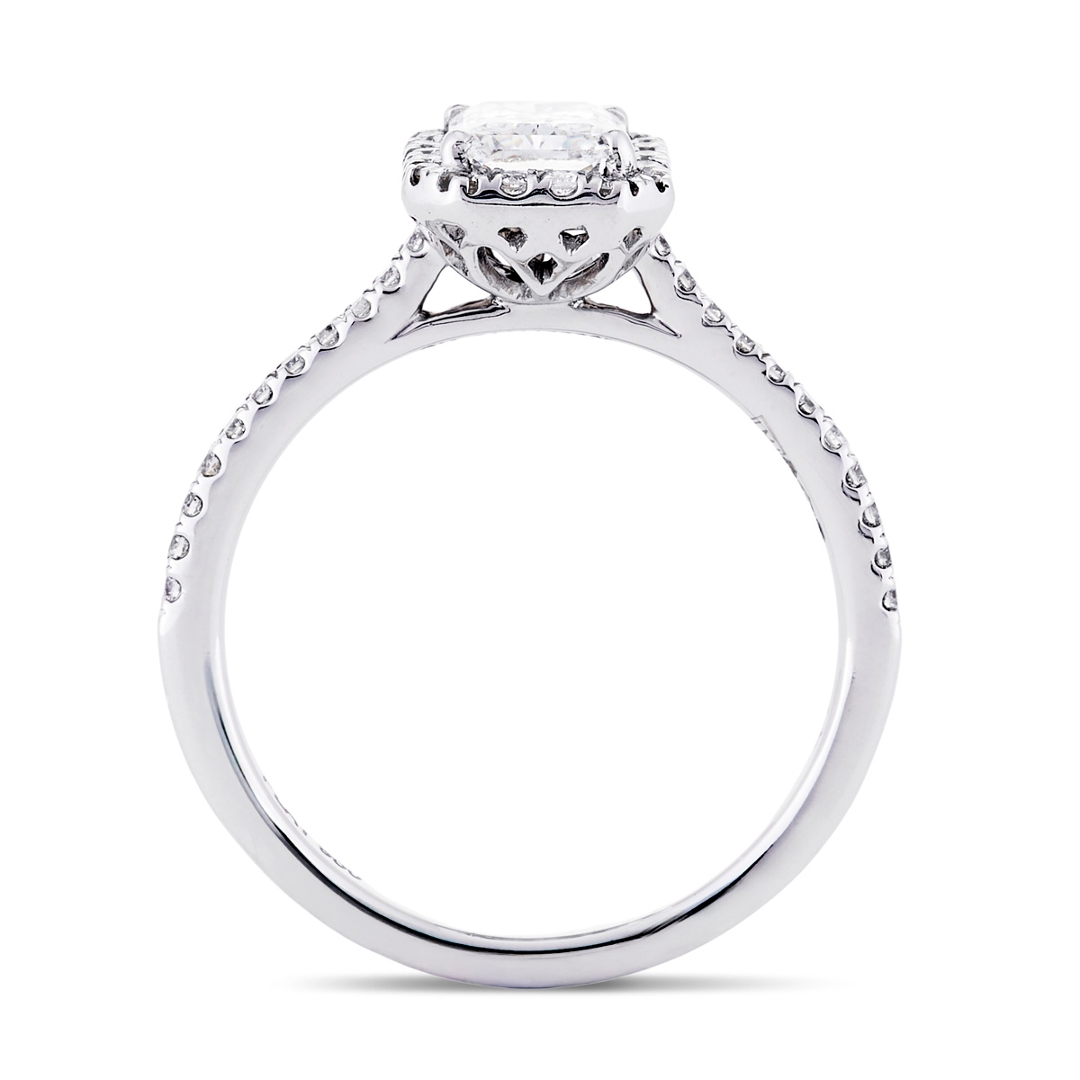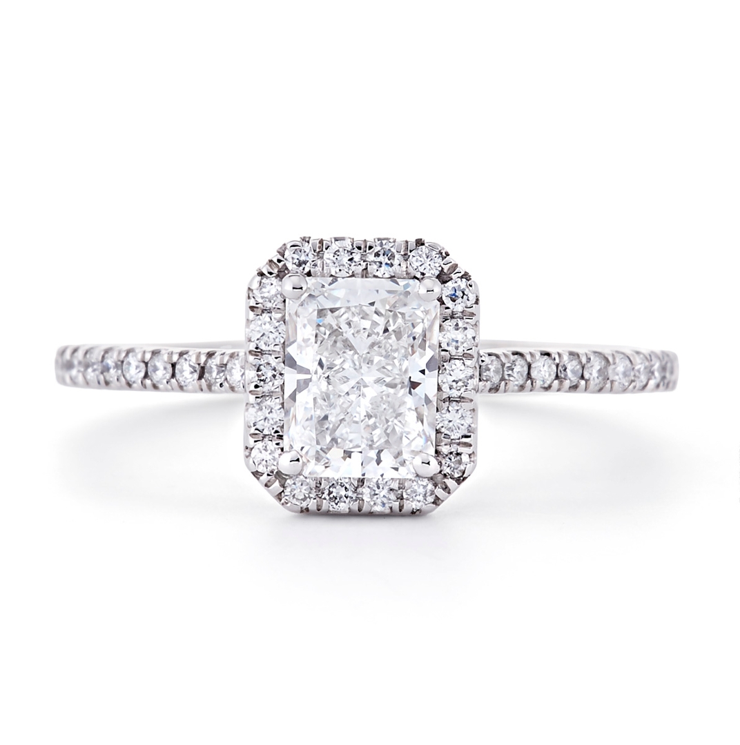 Surrounding the radiant diamond is a halo of brilliant-cut diamonds that enhances its sparkle and creates a striking, light-catching effect. The brilliance continues down the shoulders, where more brilliant-cut diamonds are meticulously set, adding an extra glamour. These additional diamonds have a total weight of 0.24ct and are graded F-G in colour and SI1 in clarity, complementing the central stone with harmonious sparkle.