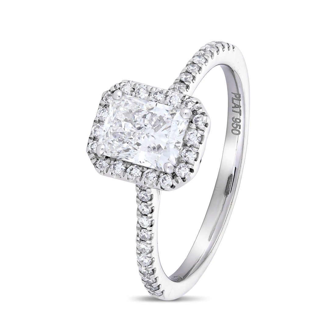 A brand new, unused GIA-certified natural diamond solitaire engagement ring set with one radiant-cut diamond to the centre & a cluster of brilliant-cut diamonds in a halo setting & to the shoulders, set in platinum.