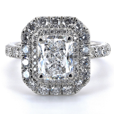 A brand-new, unused, GIA-certified natural diamond solitaire engagement ring, with one radiant-cut diamond to the centre & a cluster of brilliant-cut diamonds in a double halo setting & on the shoulders, set in platinum.