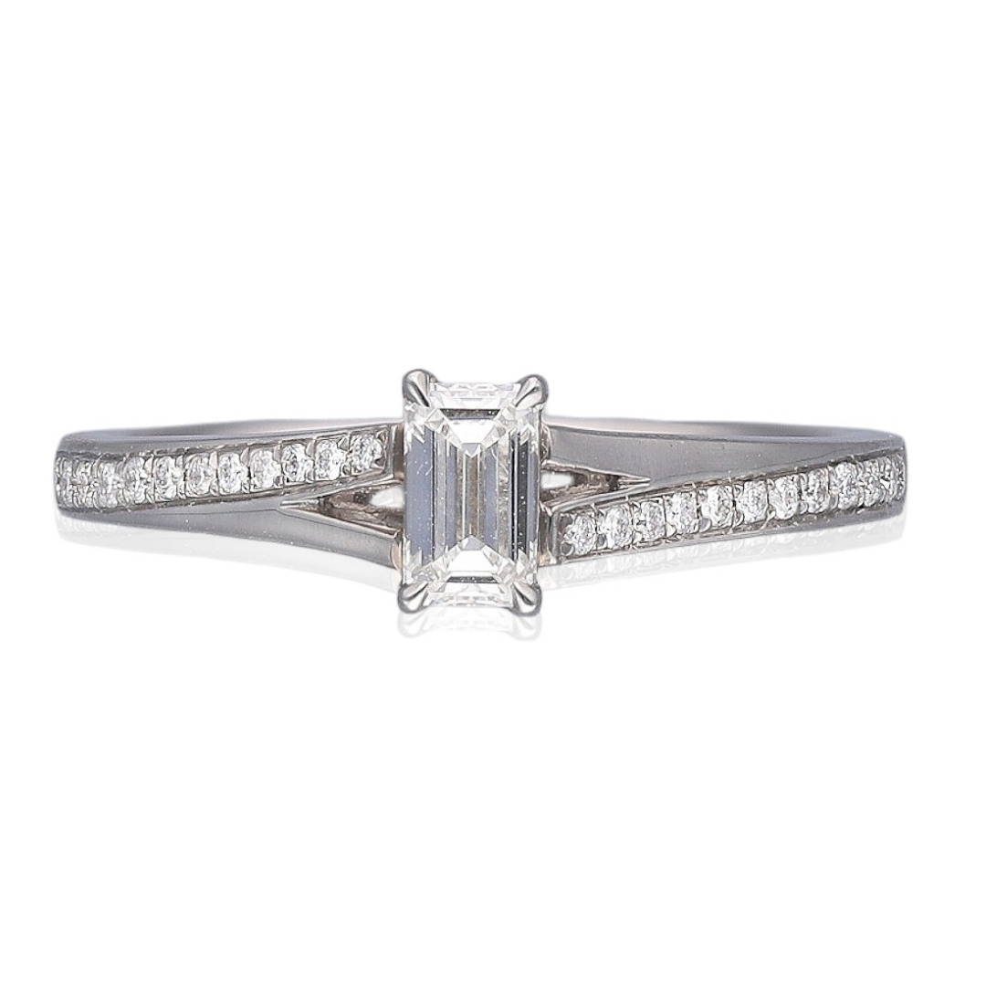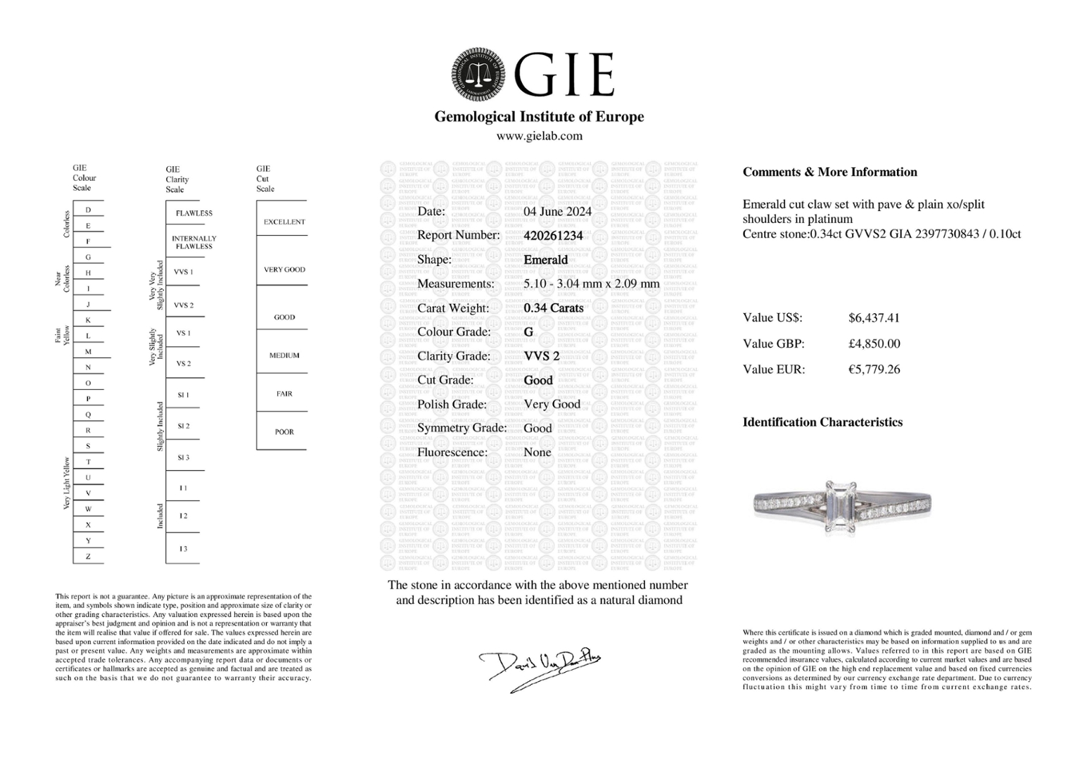 A brand-new, unused GIA-certified platinum natural diamond solitaire ring is a stunning, valuable piece of jewellery. The ring features an elegant emerald-cut diamond as its centrepiece, weighing 0.34 carats. The emerald cut is known for its sophisticated, timeless appeal, showcasing the diamond's clarity and colour through its significant, open facets. Complementing the centre stone, the ring also includes a cluster of brilliant-cut diamonds on the shoulders, collectively weighing 0.10 carats. These smaller diamonds add sparkle and enhance the ring's overall aesthetic.