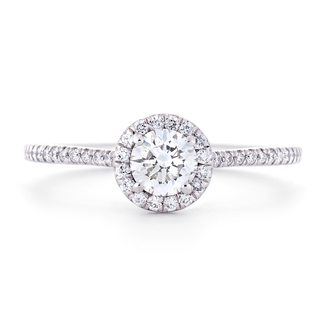 Surrounding the centre diamond is a delicate halo of brilliant-cut diamonds, artfully arranged to enhance the overall shimmer and create a sense of depth and dimension. These dazzling stones continue along the shoulders, forming a graceful cluster that complements the central gem. The additional diamonds have a combined weight of 0.17ct, with G-H colour and SI1-SI2 clarity, delivering subtle sparkle and refinement from every angle.