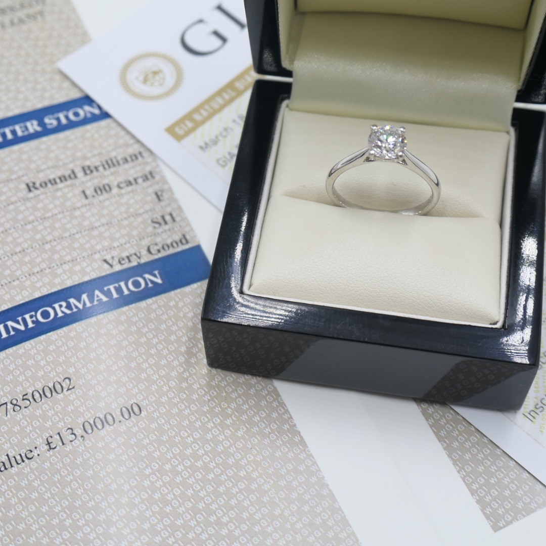 A brand-new, unused GIA-certified 18ct white gold natural diamond solitaire engagement ring, featuring a brilliant-cut diamond weighing 1.00 carats, SI1 clarity, and F colour grade, epitomises elegance and sophistication. The choice of a brilliant-cut diamond ensures maximum sparkle and brilliance, making it a captivating centrepiece for the ring. The SI1 clarity grade indicates that the diamond has slight inclusions that are difficult to detect without magnification, ensuring a stone of high quality and beauty.