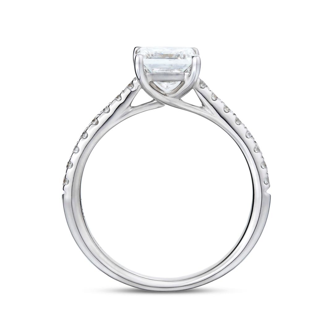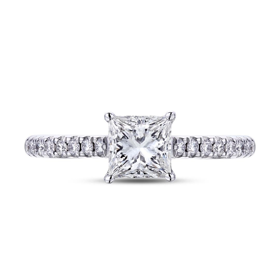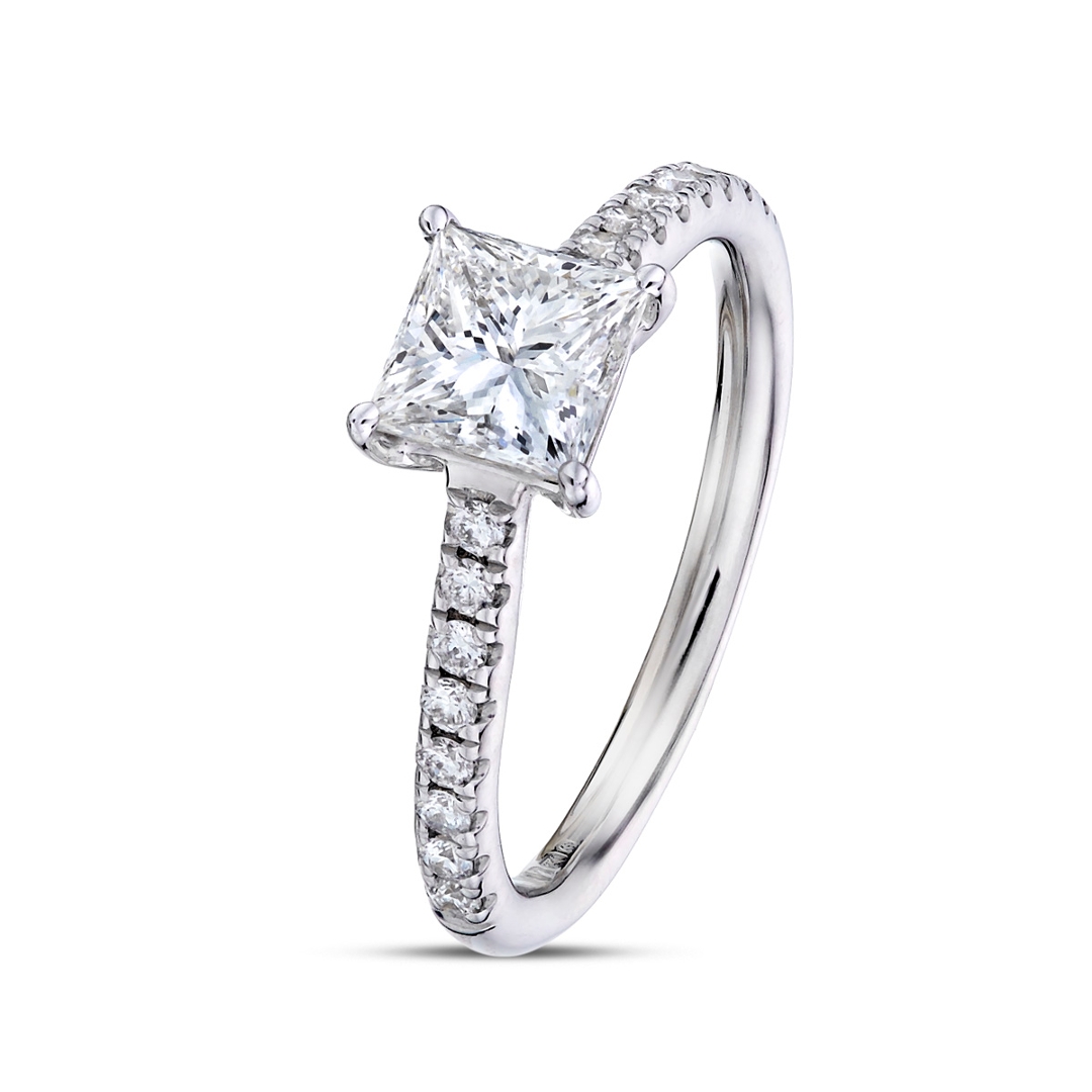 A brand-new, unused, GIA-certified natural diamond solitaire engagement ring set with one princess-cut diamond at the centre & a cluster of brilliant-cut diamonds to the shoulders, set in 18ct white gold.