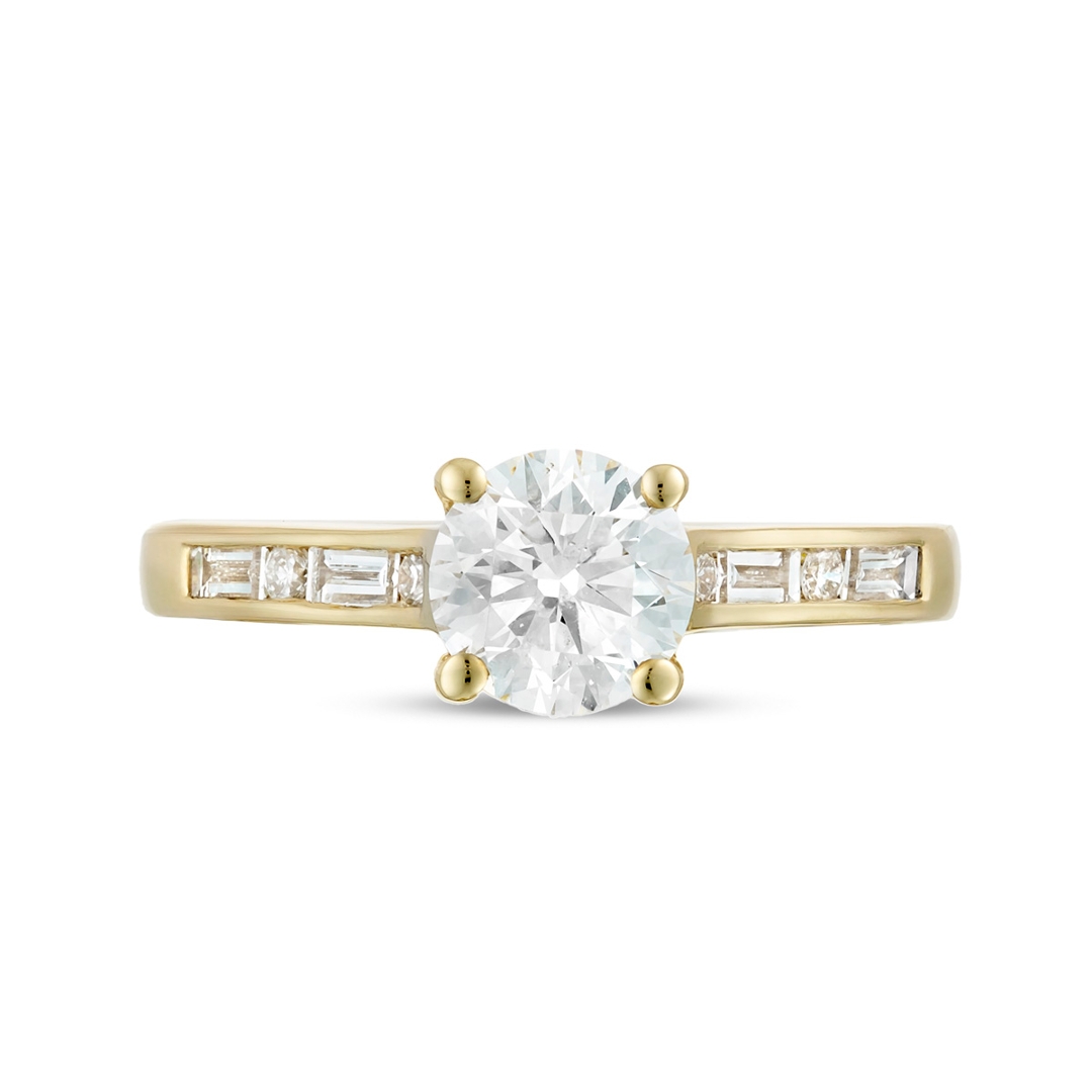A brand-new, unused GIA-certified natural diamond solitaire engagement ring, centred around a beautifully proportioned 1.00ct brilliant-cut diamond, enhanced by a sophisticated arrangement of baguette-cut and brilliant-cut diamonds along the shoulders, all set in 18ct yellow gold. The centre stone displays an impressive F colour, offering a bright, colourless appearance, while its SI2 clarity delivers a pleasing balance of visual performance and value. The shoulder diamonds, totalling 0.24ct, are of higher F–G colour and VS1–VS2 clarity, introducing a refined contrast and elevating the overall brilliance of the design.