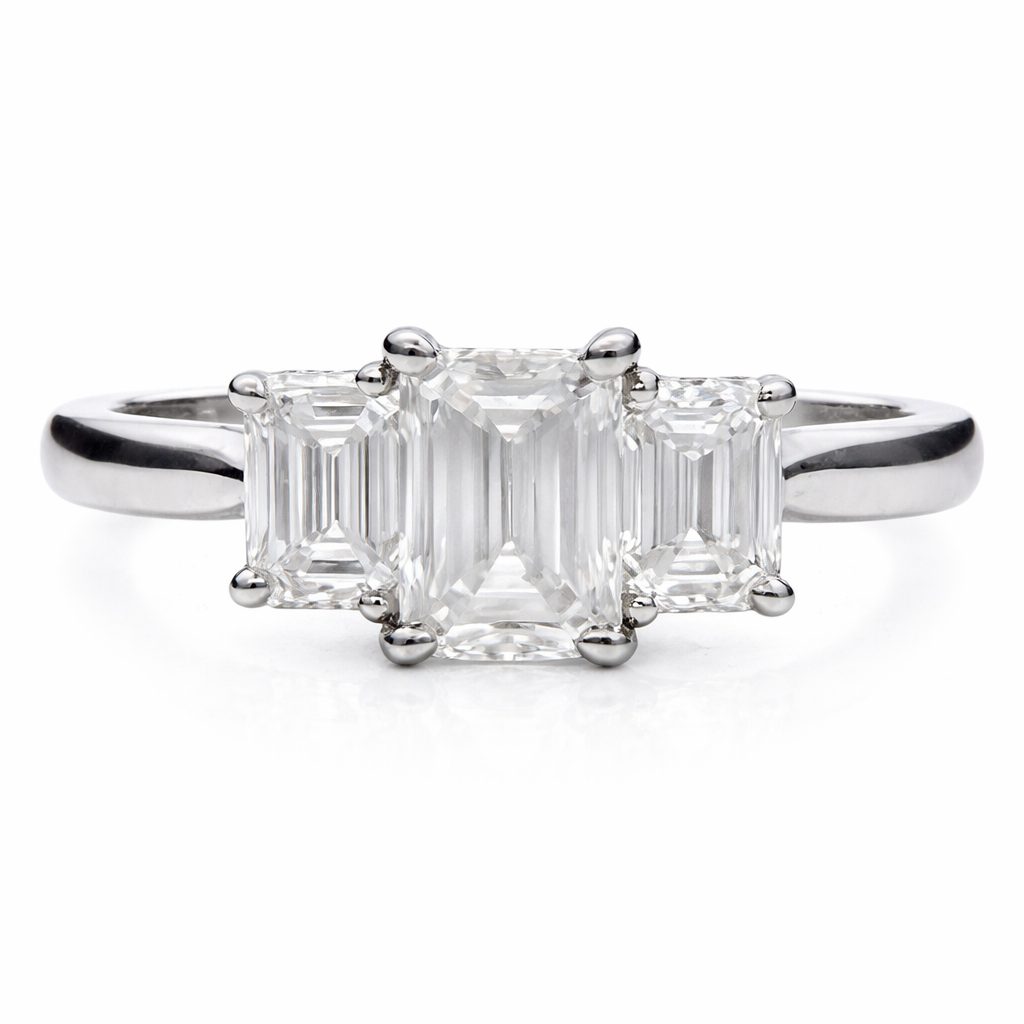 A brand-new, unused GIA-certified natural diamond three-stone cluster ring that brings together refined geometry, exceptional clarity, and the enduring desirability of genuine diamonds. Set with three emerald-cut natural diamonds totalling 1.31ct in D–E colour and VS clarity, the ring offers a bright, sophisticated appearance with clean lines and impressive light performance. Each diamond has been chosen for its crisp transparency and elegant step-cut structure, creating a balanced trio that reflects light with subtle flashes and confident depth. The colour grades' purity enhances the stones' refinement, while VS clarity ensures the diamonds remain bright and lively from every angle. These natural diamonds command a strong premium, valued for their authenticity, rarity, and the lasting prestige that continues to define naturally formed stones in fine jewellery.