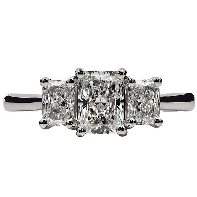 A brand-new, unused GIA-certified natural diamond three-stone cluster ring, set in platinum and composed of three beautifully matched radiant-cut diamonds with a combined weight of 1.73ct. Each diamond is graded E colour, placing them within the exceptional colourless category, and ranges from VVS2 to VS1 clarity, offering outstanding purity and crisp transparency. The radiant cut blends the elegance of step-cut structure with the brilliance of a modified brilliant facet pattern, resulting in sharp definition and remarkable light return.