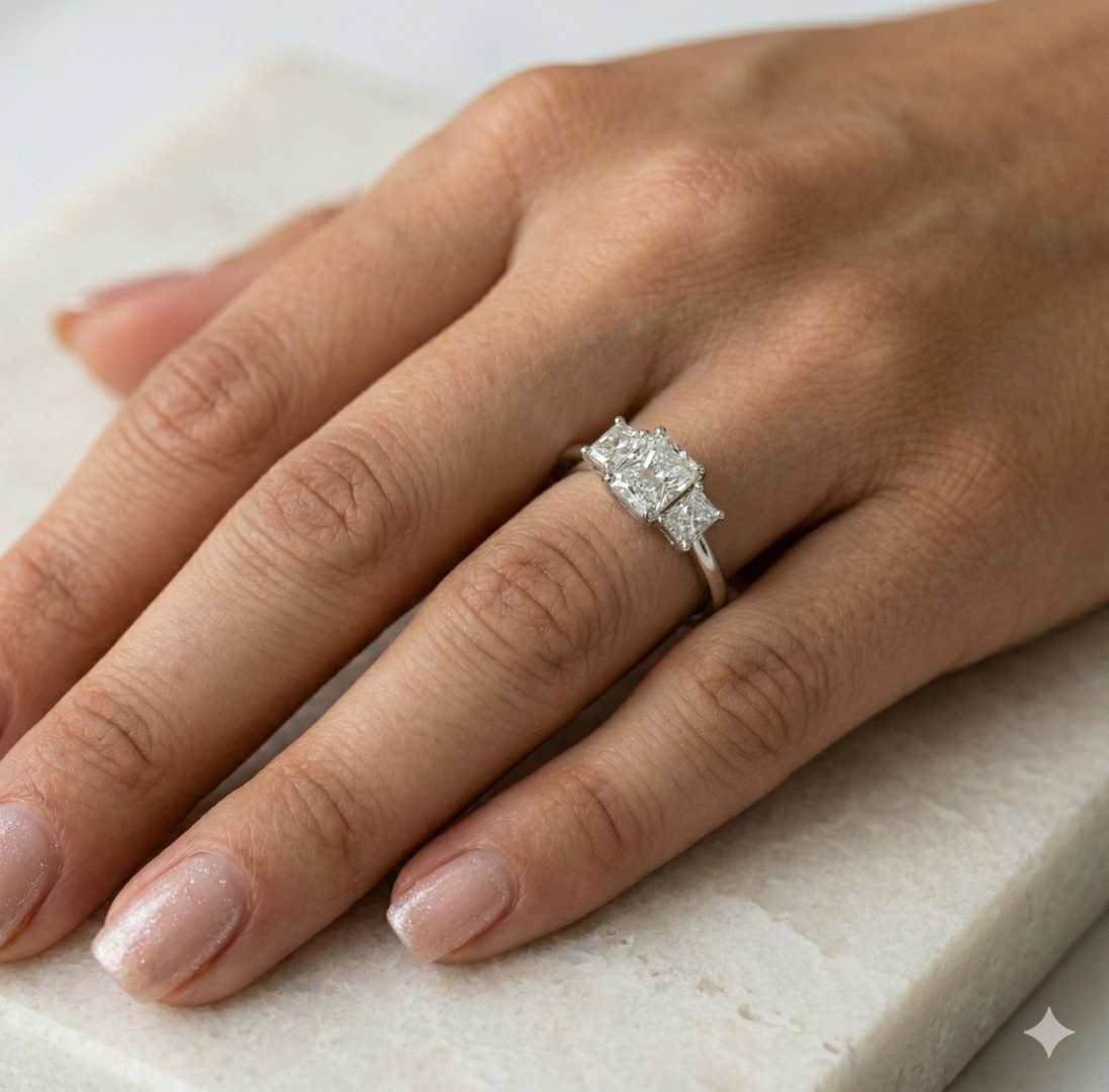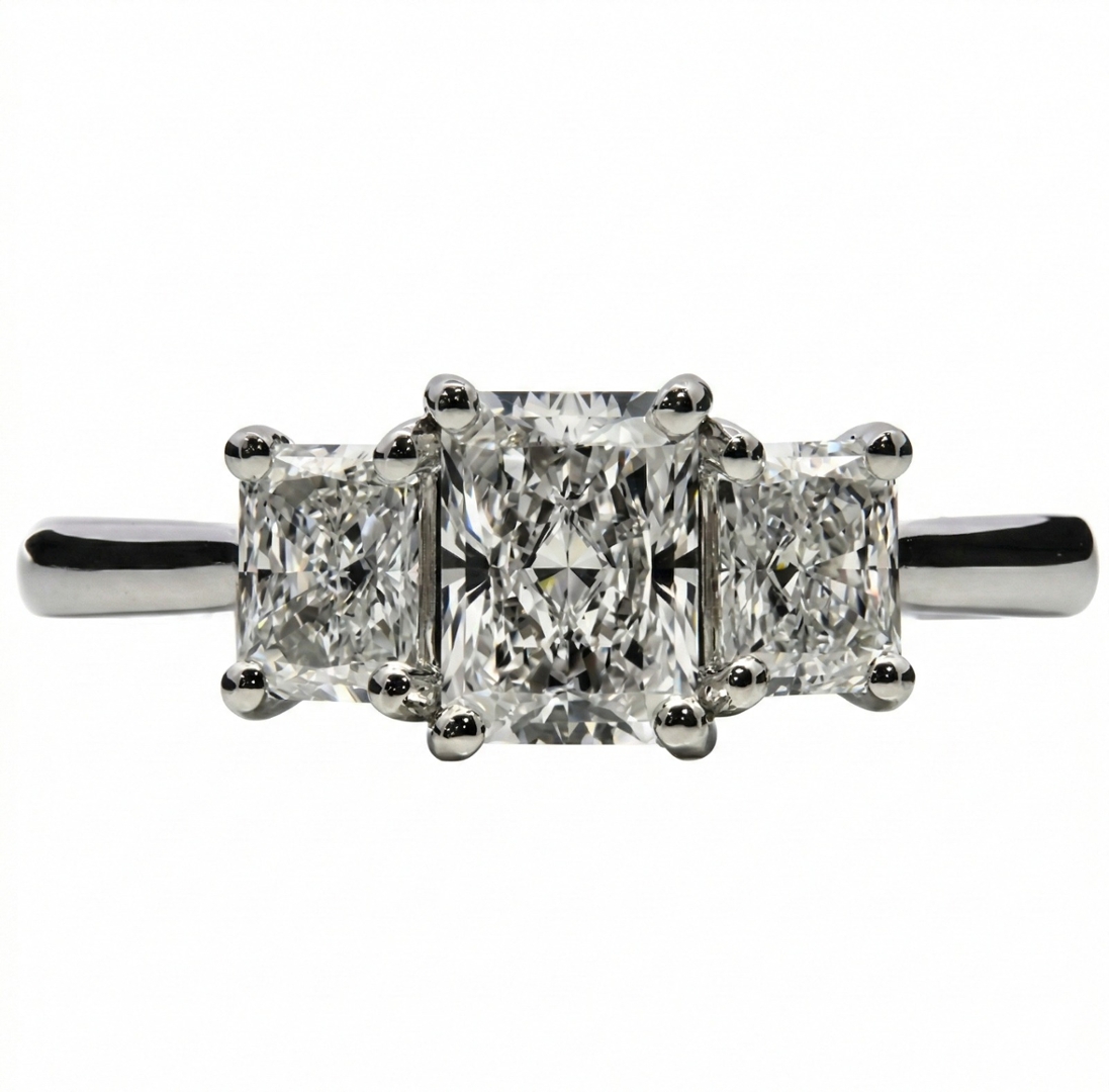 A brand-new, unused GIA-certified natural diamond three-stone cluster ring, set in platinum and composed of three beautifully matched radiant-cut diamonds with a combined weight of 1.73ct. Each diamond is graded E colour, placing them within the exceptional colourless category, and ranges from VVS2 to VS1 clarity, offering outstanding purity and crisp transparency. The radiant cut blends the elegance of step-cut structure with the brilliance of a modified brilliant facet pattern, resulting in sharp definition and remarkable light return.