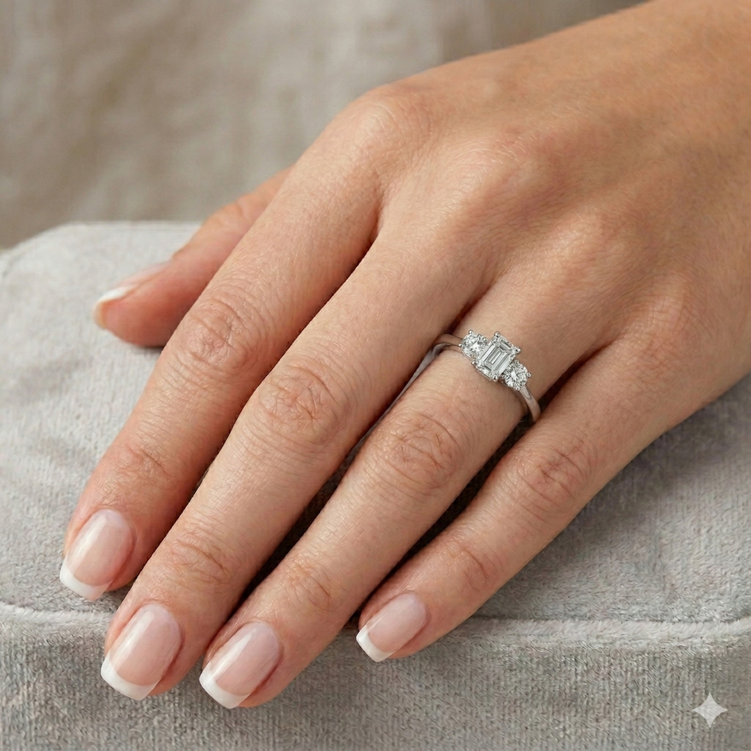 A brand-new, unused natural diamond three-stone cluster ring of commanding presence, centred around a GIA-certified emerald-cut diamond weighing 1.01ct. Graded F for colour and SI1 for clarity, the centre stone presents a bright, refined appearance with crisp step facets that emphasise structure, symmetry, and elegant restraint rather than excessive sparkle. Two brilliant-cut diamonds, positioned on either side, add a combined weight of 0.81 ct, creating contrast and lively brilliance while maintaining visual balance across the setting.
