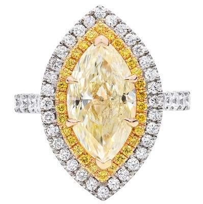 Surrounding the marquise-cut diamond is a refined double-halo composition that enhances depth and brilliance. A cluster of yellow brilliant-cut diamonds totalling 0.12 carats forms the inner halo, intensifying the centre stone. In comparison, an outer halo and shoulder-set of natural brilliant-cut white diamonds totalling 0.77 carats provide contrast and sparkle. This layered arrangement creates strong visual balance, guiding the eye across the ring while maintaining the centre diamond's dominance.