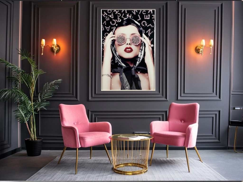 A crystal art masterpiece titled 'Designer Lady in a Black Head Scarf' captures the essence of modern elegance and sophistication with impeccable detail. This stunning glass art picture portrays a stylish lady donning a chic black head scarf and pink sunglasses, exuding an air of effortless glamour and charm. Each element of her ensemble is meticulously crafted, from the scarf's graceful drape to the sunglasses' sleek contours, creating a sense of timeless beauty and refinement.