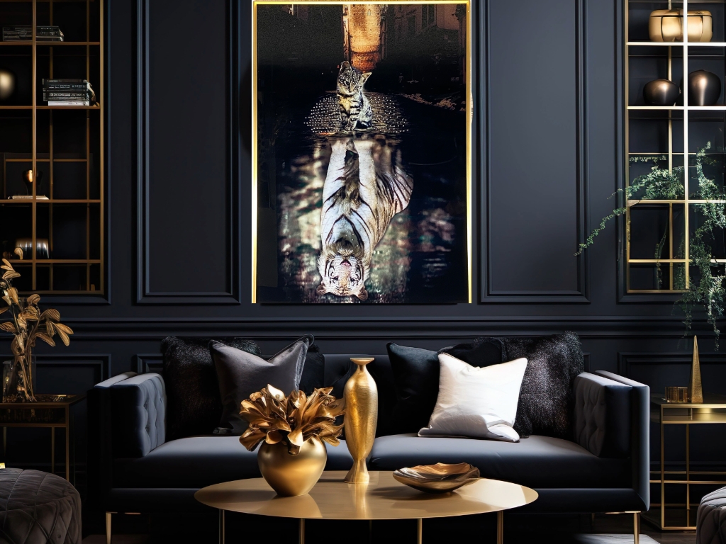 With its enchanting imagery, luxurious frame, and subtle embellishments, "Cat Reflections" is sure to captivate viewers of all ages and inspire contemplation about the profound mysteries of life. It reminds us of the beauty that surrounds us and the interconnectedness of all living creatures in the vast tapestry of the natural world.