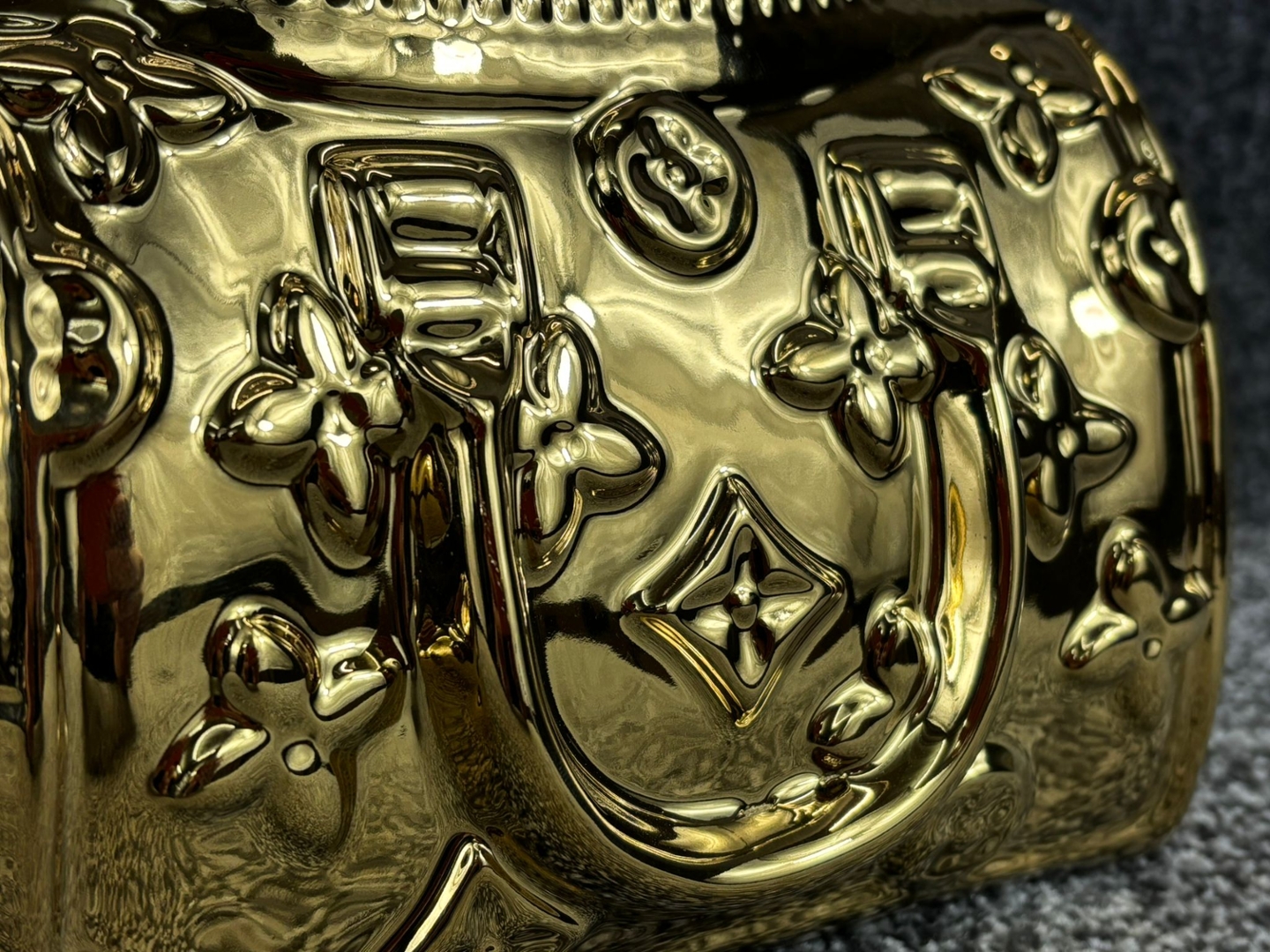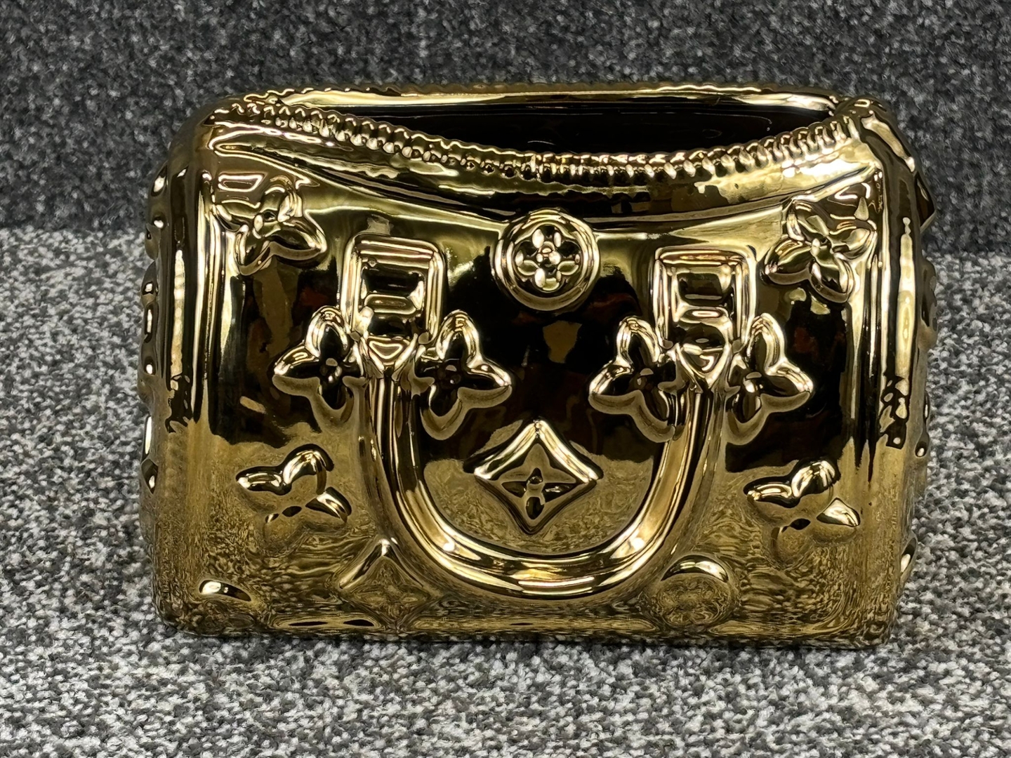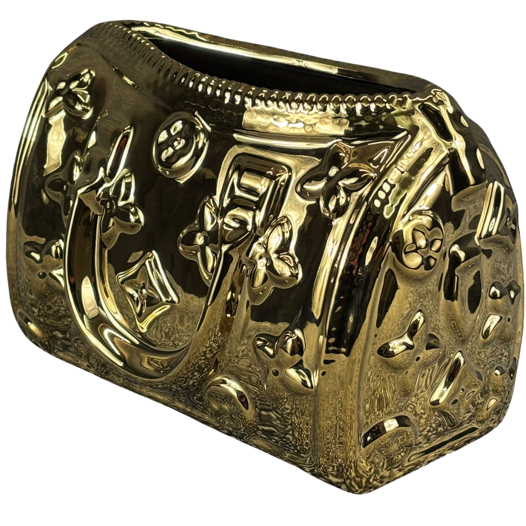 A gold ceramic handbag vase that brings a bold and luxurious touch to any décor. Designed in the shape of a handbag, this striking piece features a high-gloss metallic gold finish with embossed detailing that enhances its texture and form. The reflective surface gives it a glamorous look, making it an instant statement piece whether used functionally or decoratively.